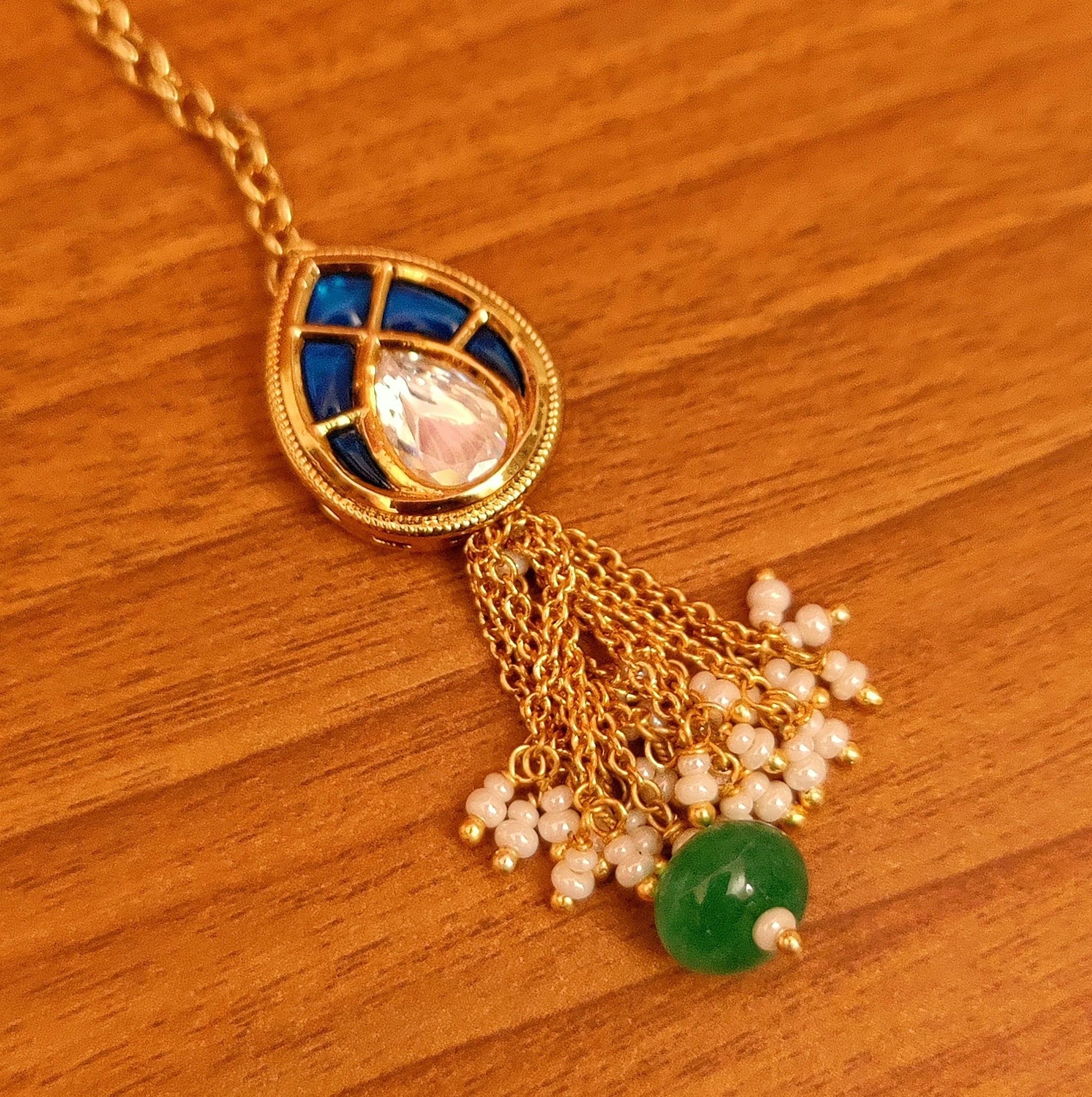 BLUE PEAR SHAPED KUNDAN LOOK EMERALD DROP MAANG TIKKA