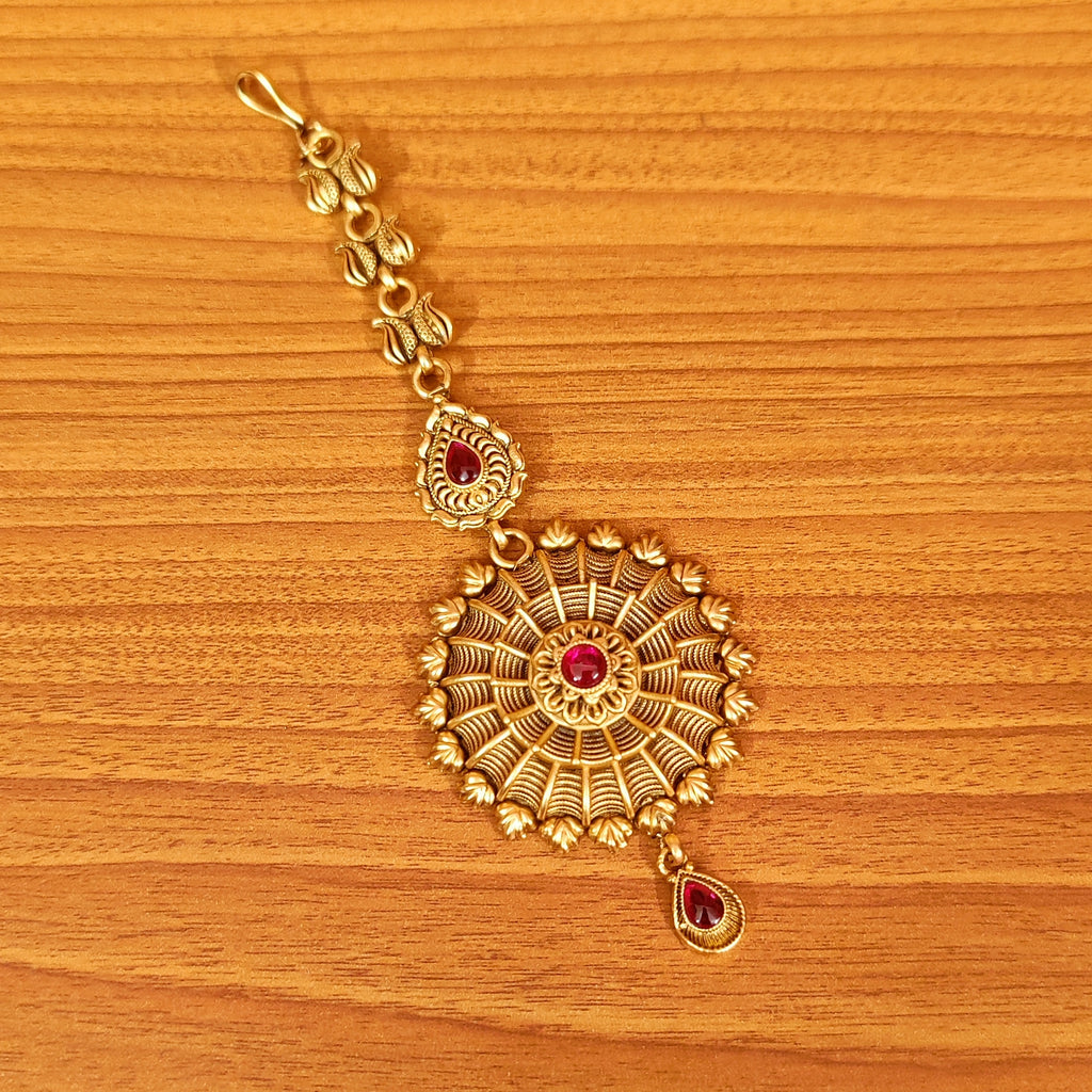 ANTIQUE MATT GOLD PLATED RUBY MAANG TIKKA