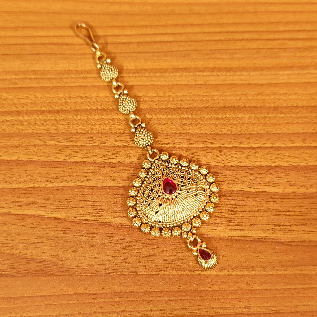 RUBY ANTIQUE MATT GOLD PLATED WEDDING MAANG TIKKA