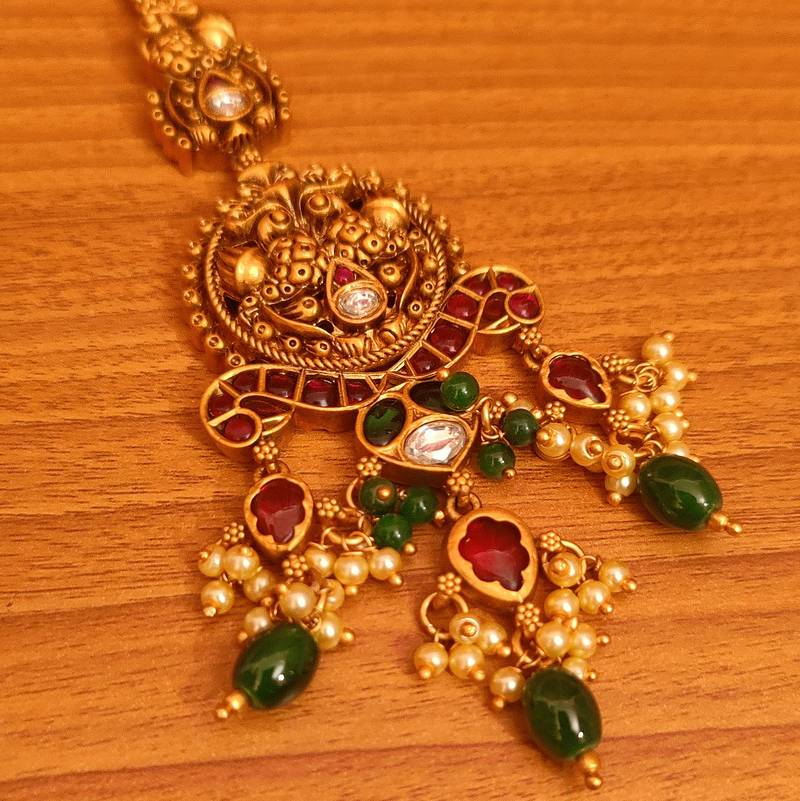 This exquisite maang tikka is skillfully crafted from matte alloy and adorned with imitation red and green kempu stones, along with high-quality semi-precious pearls and beads. Coated in 18 kt matte polish, it boasts a realistic appearance. A truly breathtaking piece, it is lightweight and budget-friendly, making it a must-have accessory.