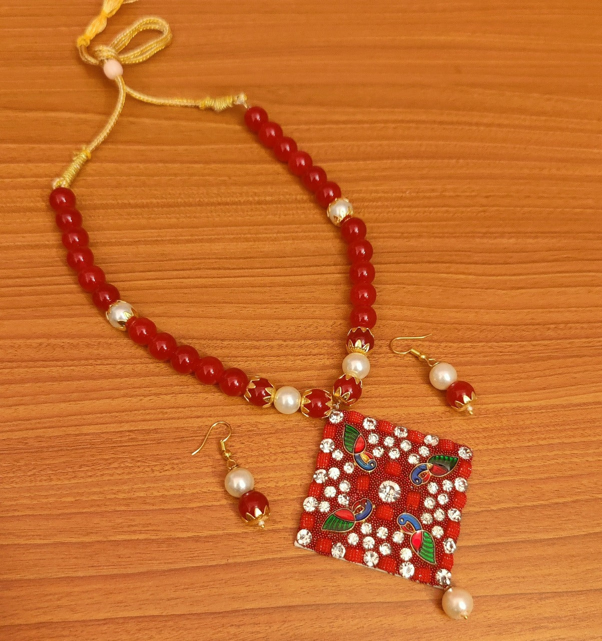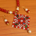 This imitation necklace set is handcrafted in copper alloy with imitation red colour beads of very fine quality . This necklace set is plated with gold plating and is light in weight.