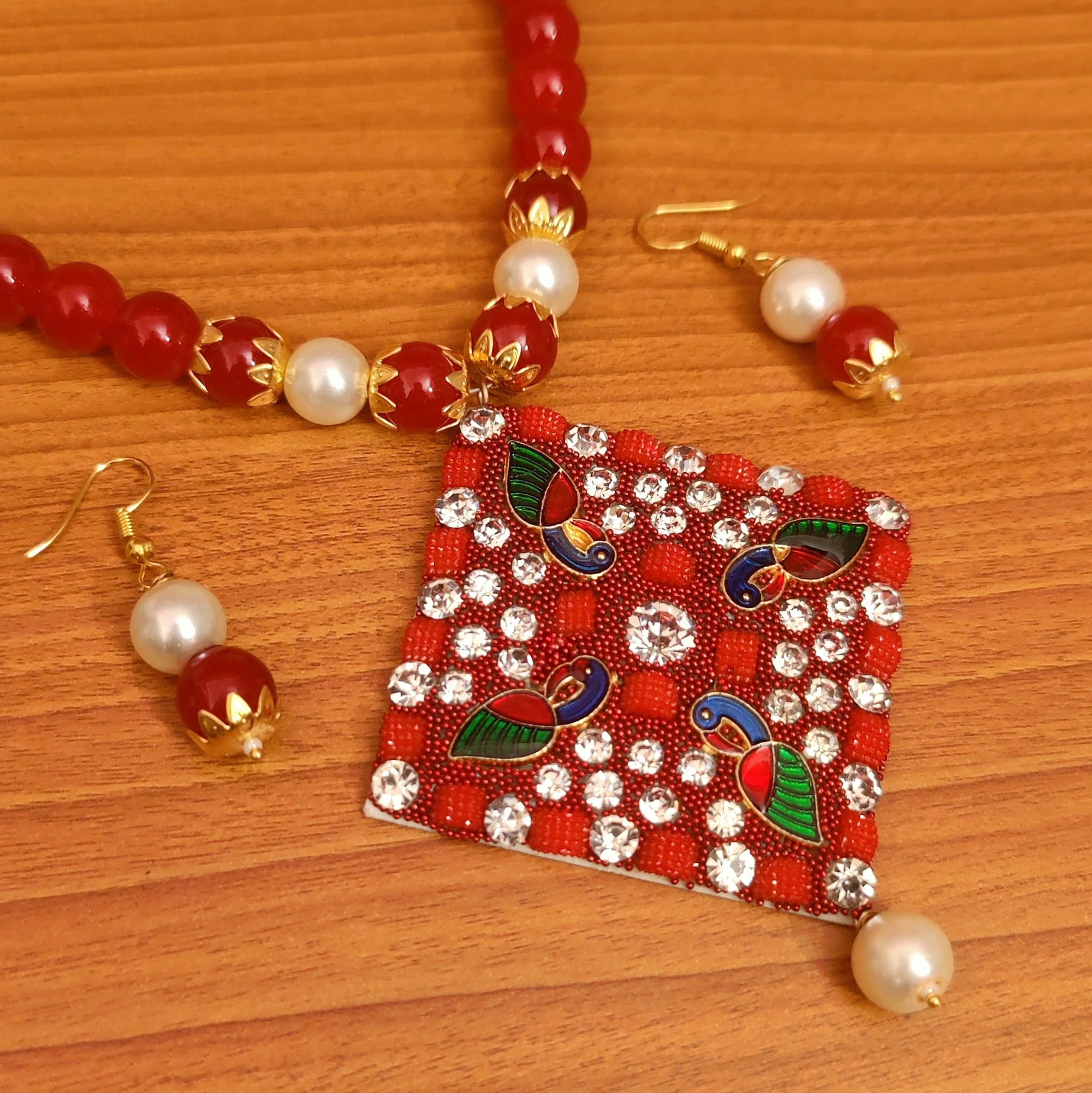 RED COLOUR PEACOCK ZIRCON STUDDED NECKLACE SET