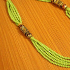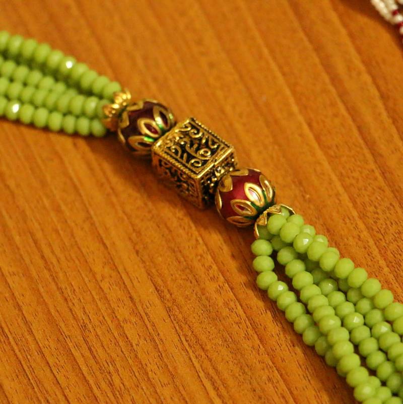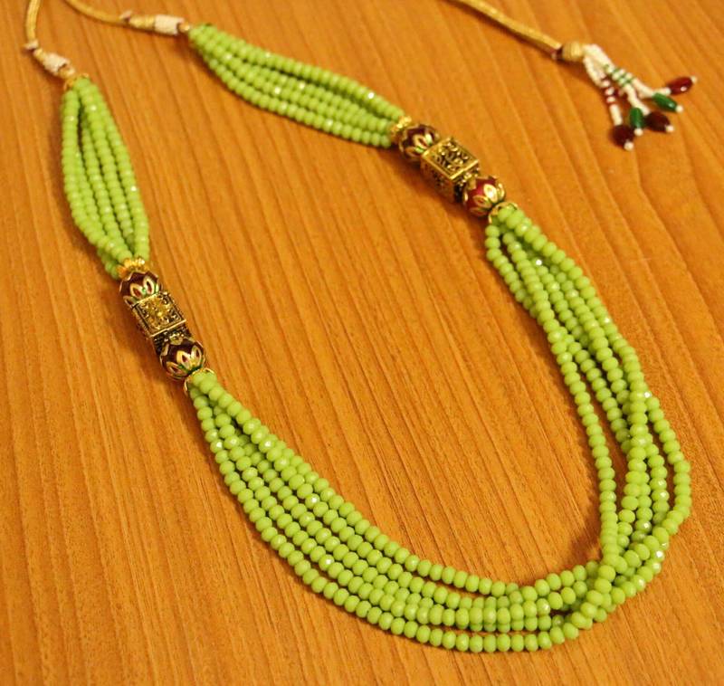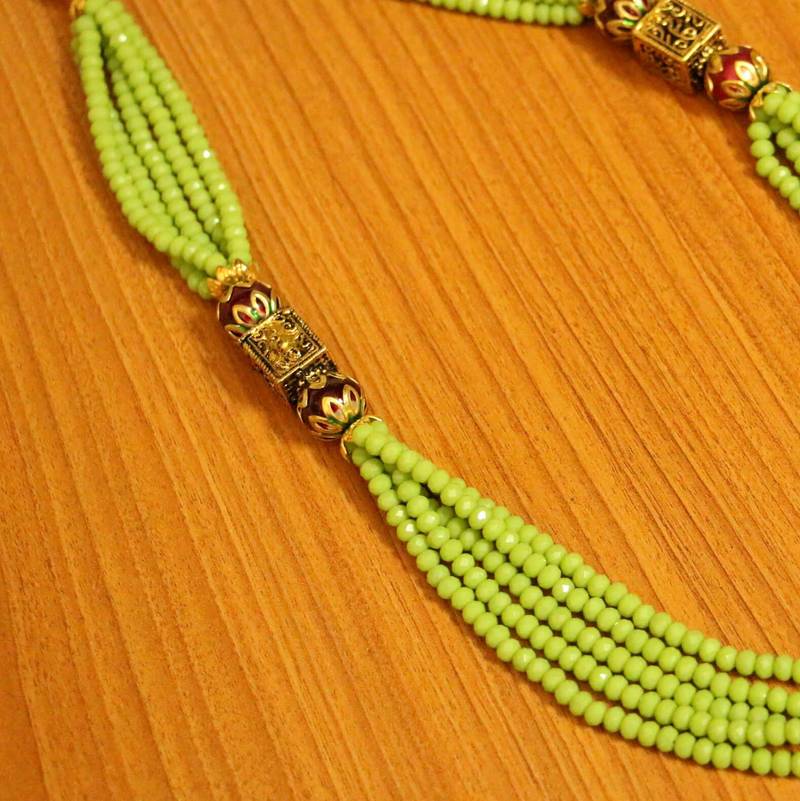 This beautiful necklace is handcrafted in beaded alloy with imitation green crystal work of very fine quality . This necklace are coated with antique gold polish bead which give them a unique look . An absolutely stunning piece to own and are very light in weight.
