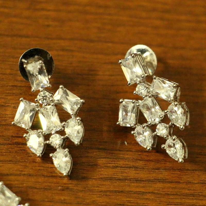 This beautiful necklace set is handcrafted in brass alloy with imitation american diamond work of very fine quality . This necklace set is coated with 18 kt white gold polish which give them a unique look . An absolutely stunning piece to own and are very light in weight.