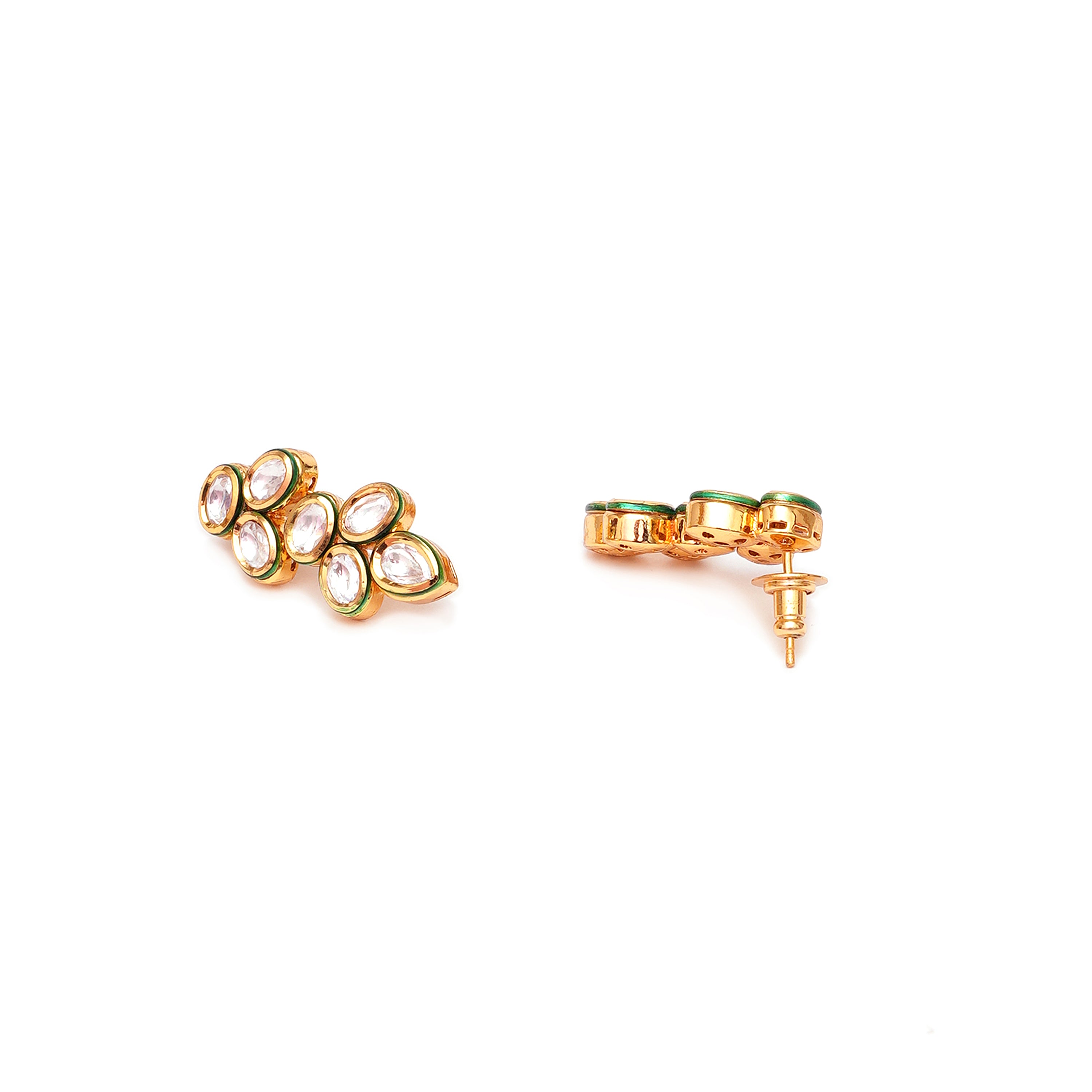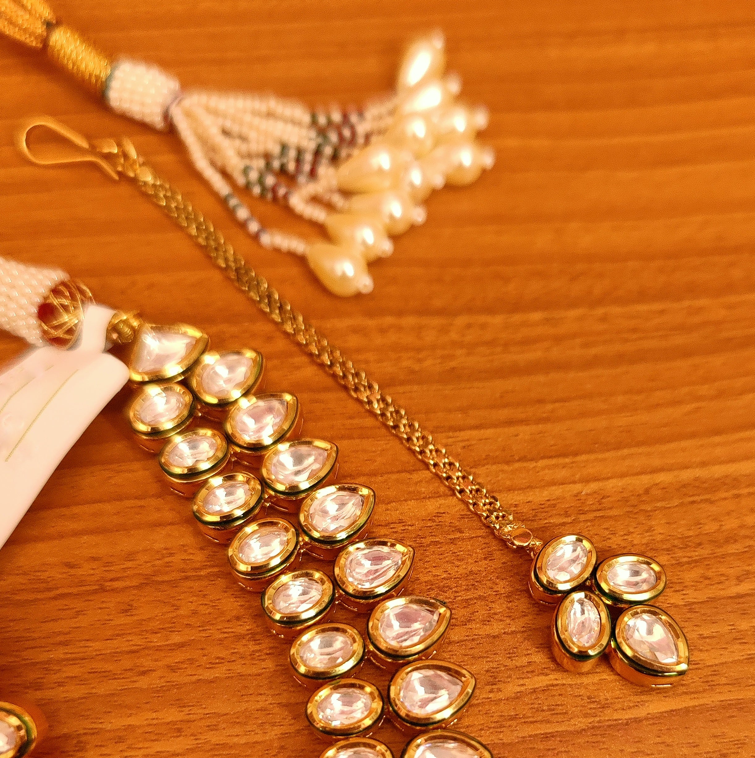 This beautiful necklace set is handcrafted in brass alloy with imitation kundan with meenakari work of very fine quality . this necklace set is coated with 18 kt gold polish which give them a unique look . an absolutely stunning piece to own and are very light in weight.