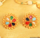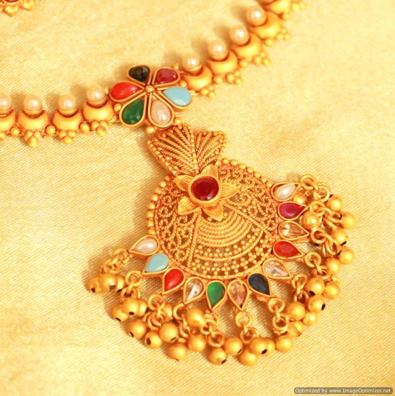 This beautiful navratan necklace set is handcrafted in copper mixed silver alloy with imitation polki & ruby of very fine quality . This necklace set is coated with 18 kt gold polish which give them a unique look . An absolutely stunning piece to own and are very light in weight.