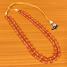 This semi precious quartz necklace is handcrafted in semi precious pink peach quartz beads and pearls of very fine quality .The necklace looks very classy and comes with an adjustable dori , that you can adjust according to your choise of length.
