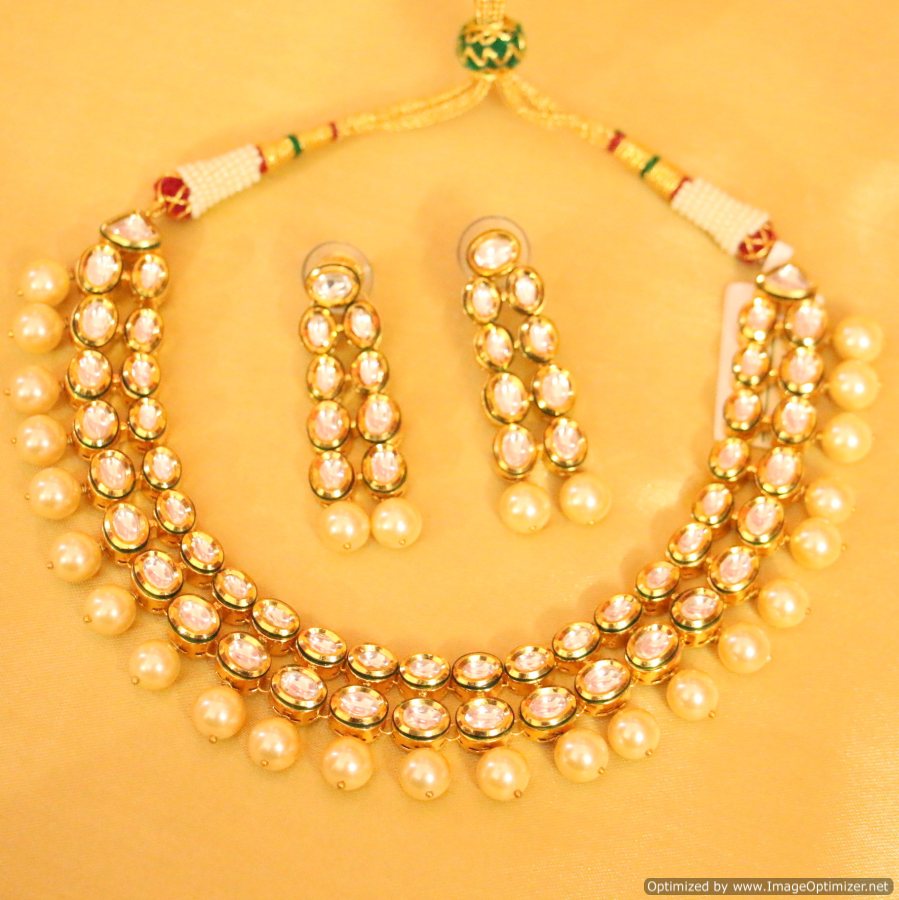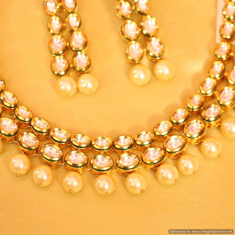 This beautiful necklace set is handcrafted in silver alloy of very fine quality with imitation kundan of very fine quality along with intricate meenakari work done behind the necklace as well as earrings. This necklace set is coated with 18 kt gold polish which give them a unique look . An absolutely stunning piece to own and are very light in weight.