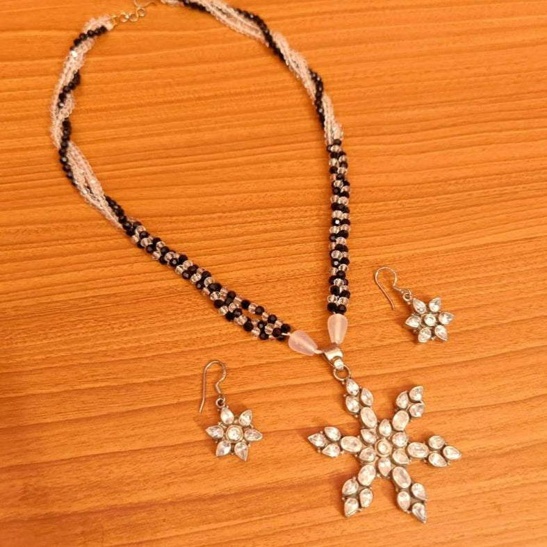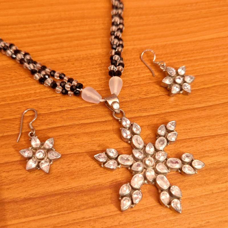 This beautiful necklace is handcrafted in silver alloy with imitation zircon of very fine quality . This necklace is coated with antique polish which give them a unique look . An absolutely stunning piece to own and are very light in weight.