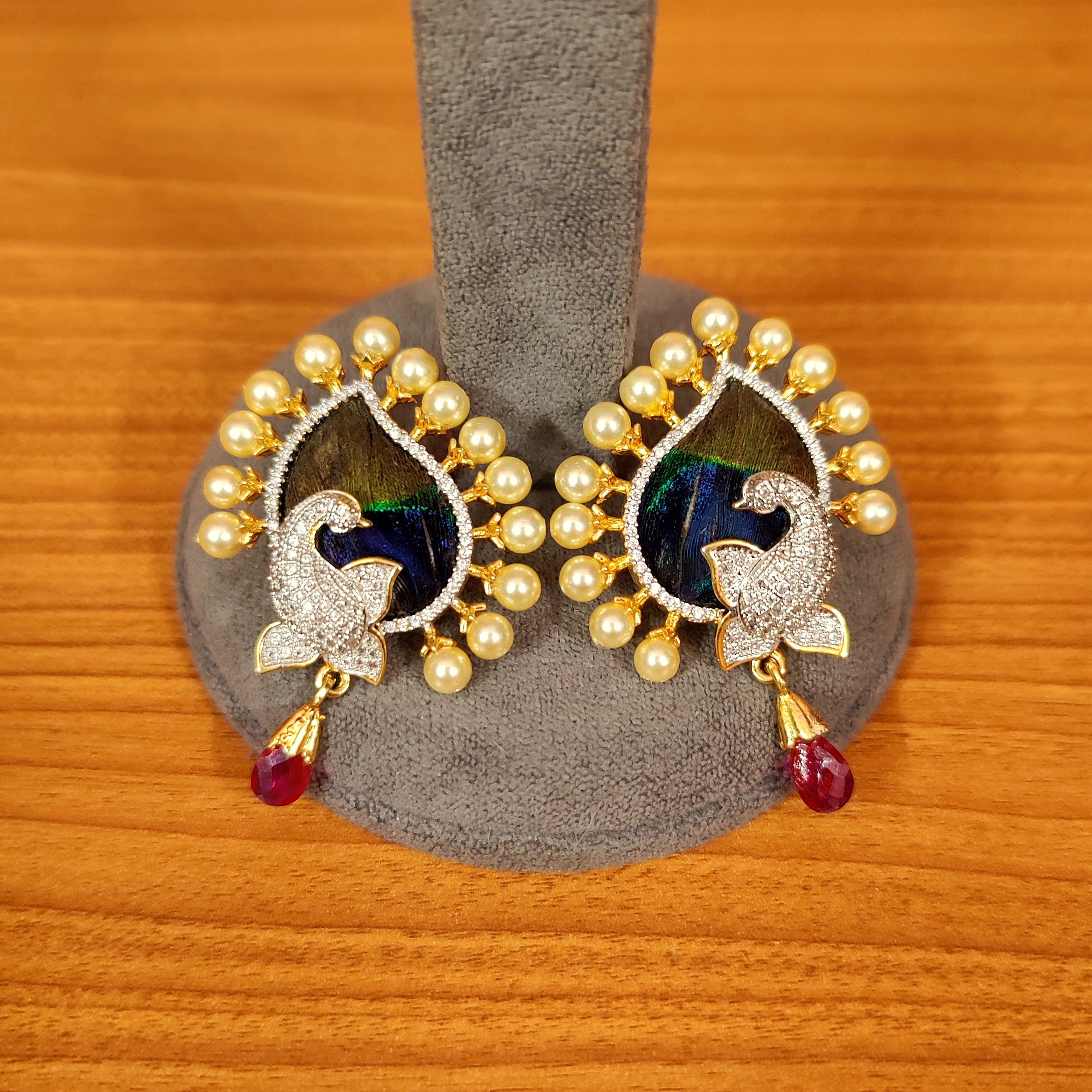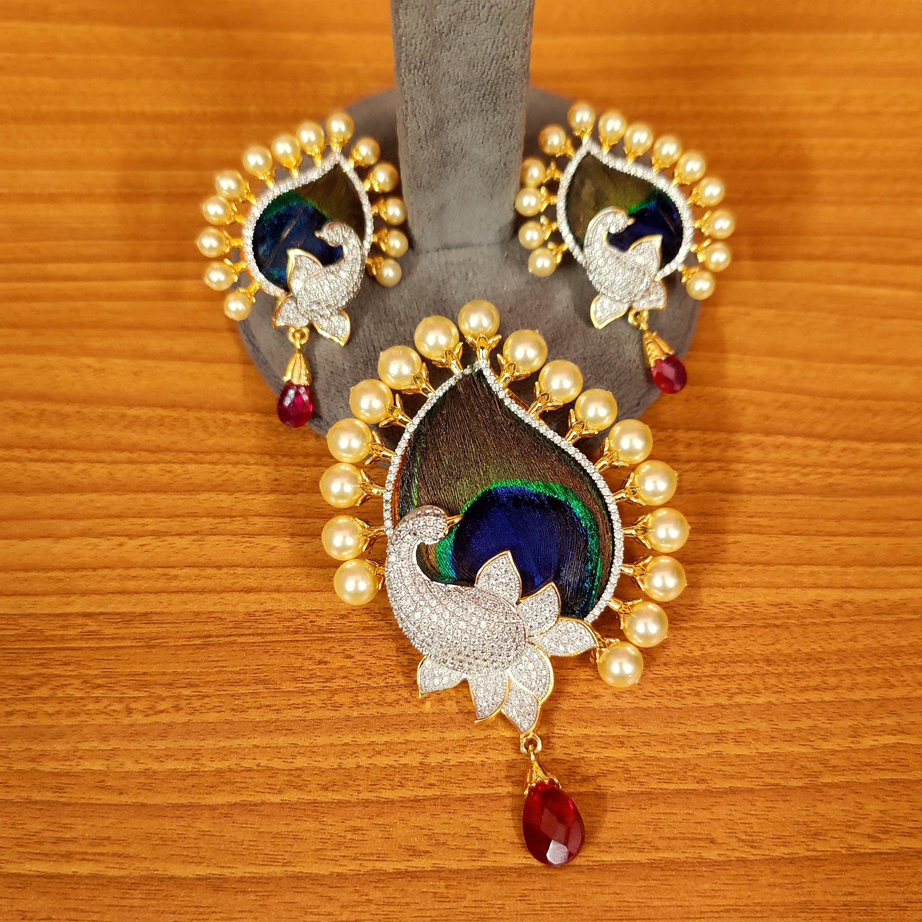 This diamond look peacock pendant set is made in silver alloy with imitation pearls and american diamond stones of extremely fine quality. this gorgeous pendant set is handcrafted to perfection with superior quality cz stones and is plated with 18kt nickle free gold rhodium that gives the design a real diamond look & comes with a matching pair of big size earrings which are absolutely gorgeous and are very light in weight.