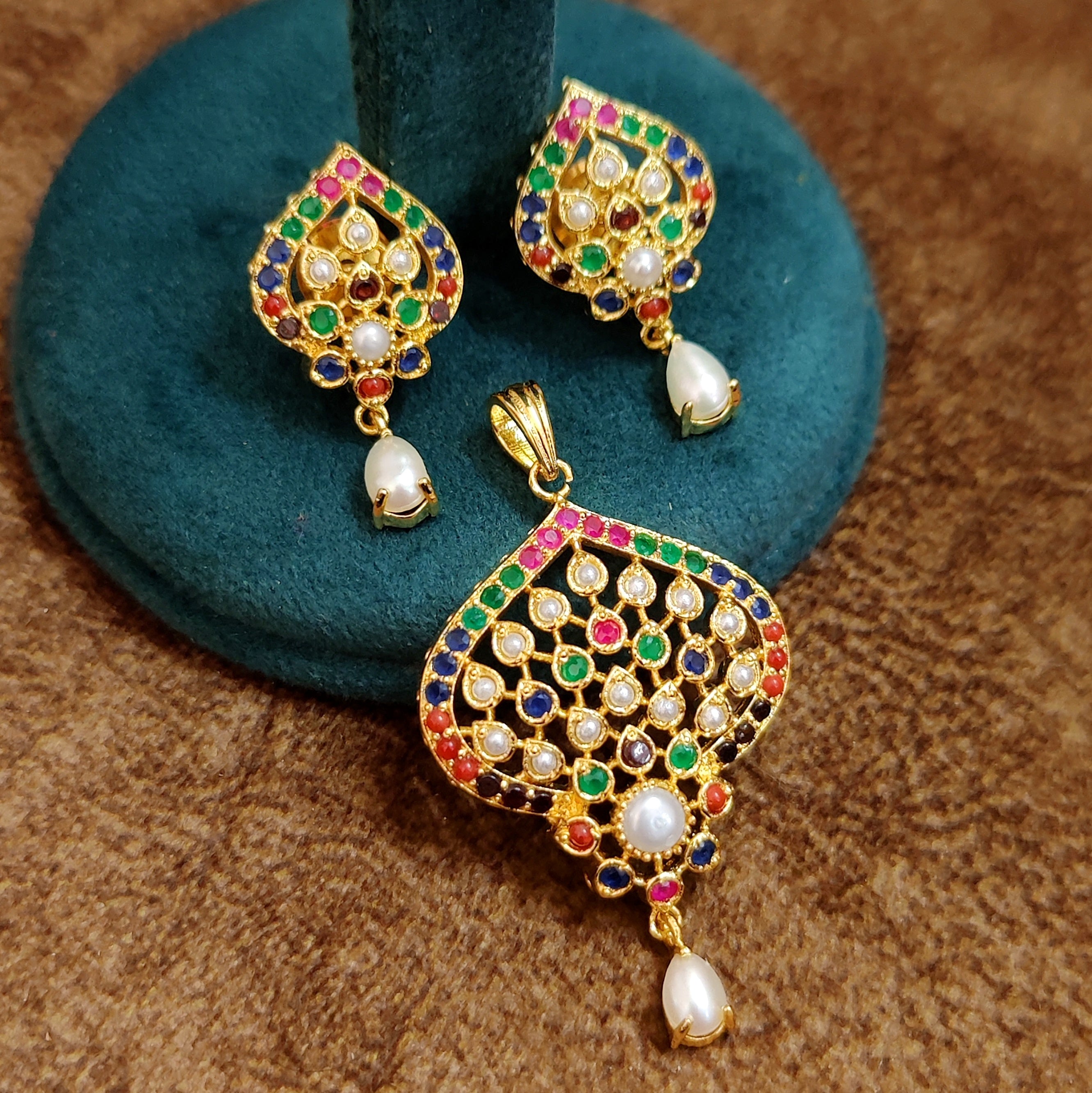 NAVRATAN LOOK CZ STUDDED GOLD PLATED PENDANT SET
