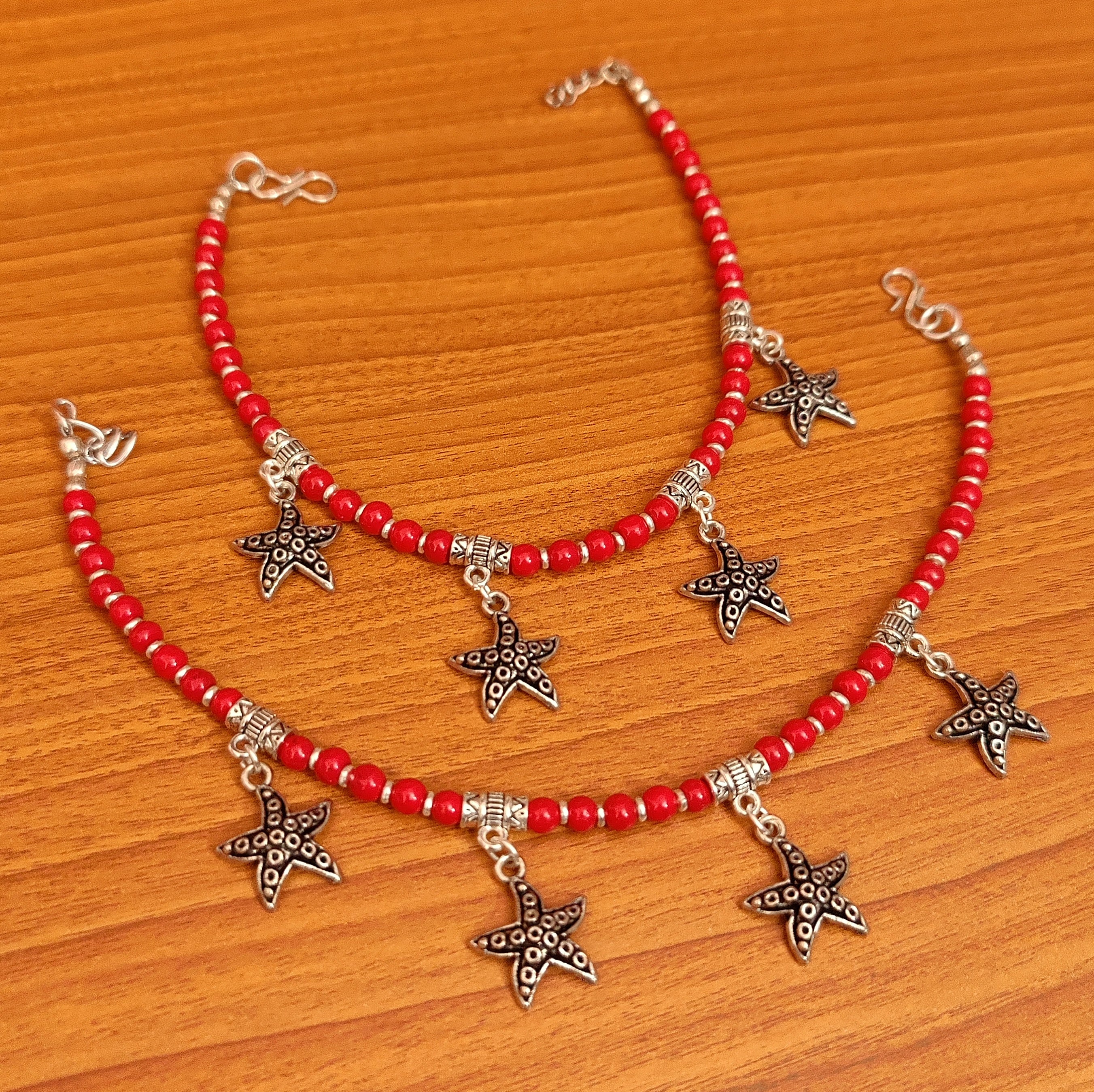 These oxidised silver plated anklets are handcrafted in metal alloy with silver plated star fish shaped metal motifs and orange colour beads. these anklets are plated in fine silver plating and are very lght in weight.