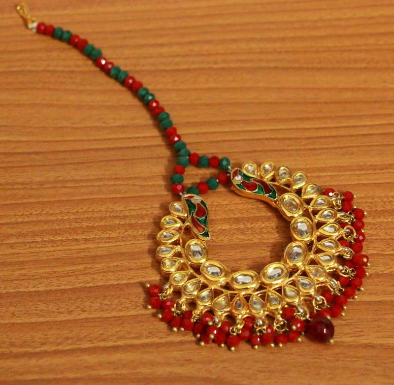 This Beautifull Maang Tikka Is Made In Silver Alloy With Fine Ruby And Kundan With Meenakari Work Of Very Fine Quality And Coated With Brass Plating With 18kt Gold Colour In It . The Maang Tikka Is Very Trendy And Is Very Light In Weight . An Absolutely Stunning Piece To Wear For A Party Or Occassion .