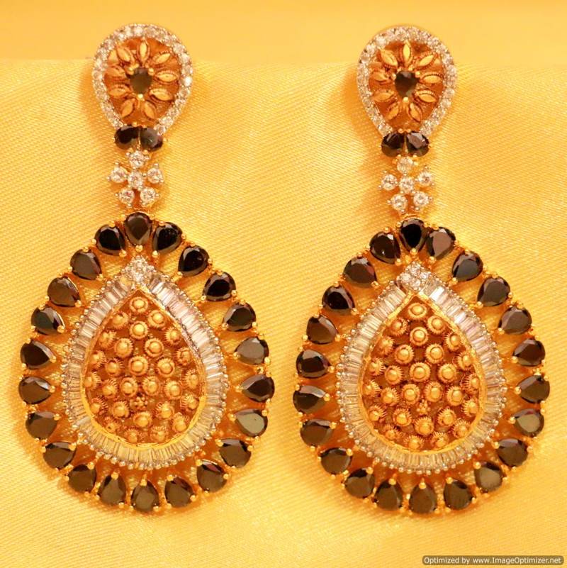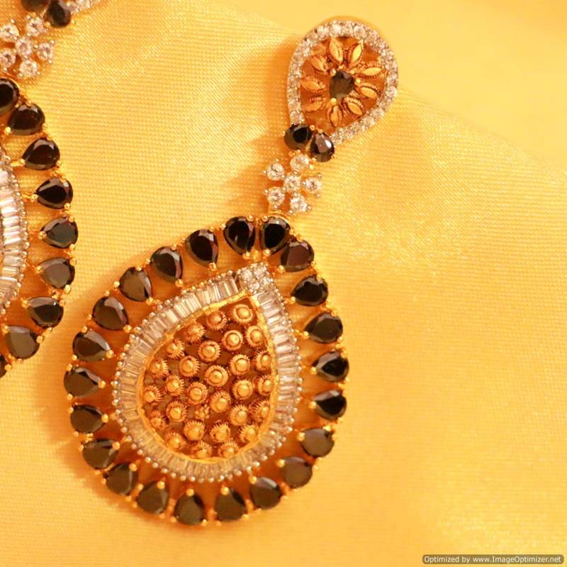These beautiful earrings are handcrafted in silver alloy with imitation black onyx & semi precious american diamonds of very fine quality. These earrings are coated with 18 kt gold polish which give them a unique look . An absolutely stunning piece to own and are very light in weight.
