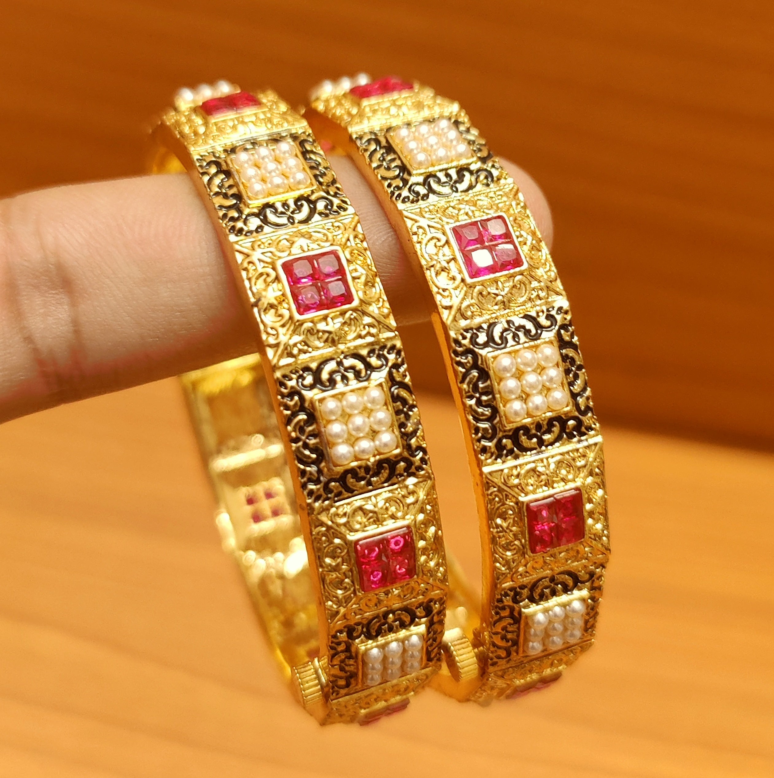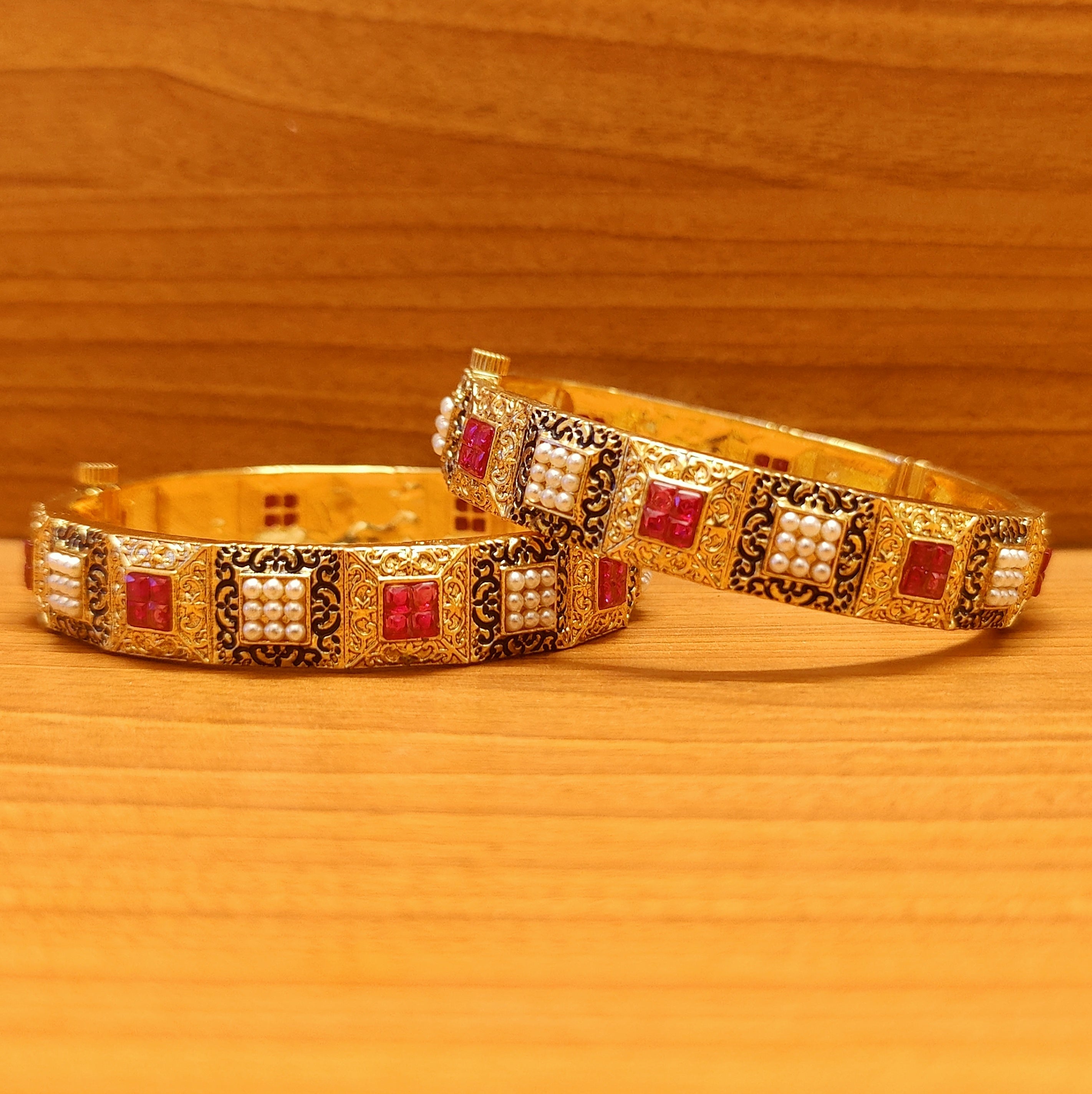 These openable bangles are handcrafted in copper alloy with imitation red ruby stone & pearls of very fine quality. These artistic yet modern bangles are plated with fine nickle free antique gold rhodium to avoid any allergies to the skin.