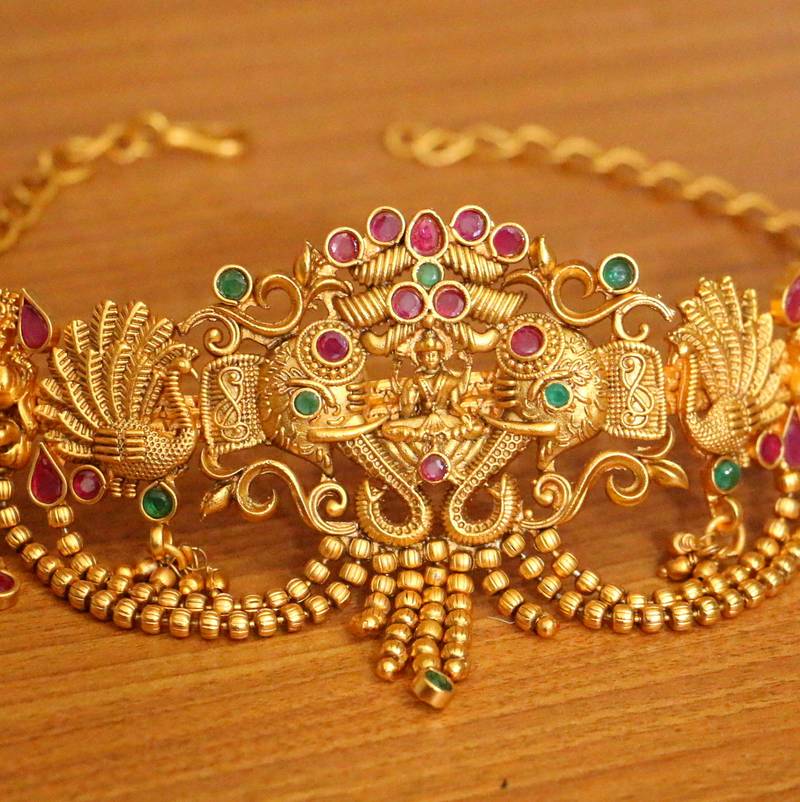 This Temple look gold plated handcrafted Bajuband is made from Copper Alloy with Imitation Stones of excellent quality. Its light weight and 18kt Matt Gold Rhodium Plating give it a lustrous, realistic Gold appearance.