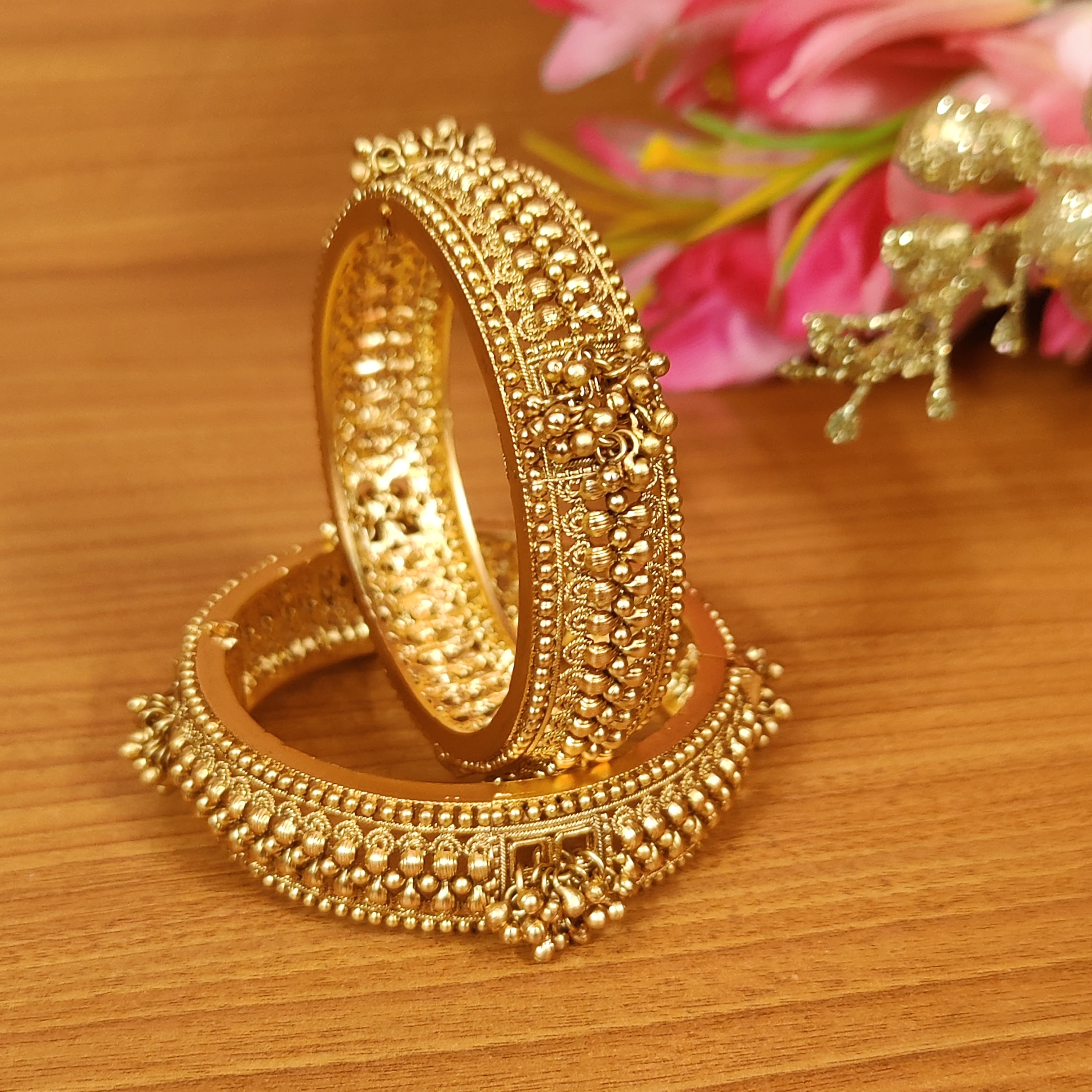 Enhance your traditional look with our Antique Gold-Plated Traditional Ghungroo Bangles, crafted to perfection for the modern woman who appreciates classic charm. Featuring intricate designs and adorned with tiny ghungroos, these bangles offer a vintage aesthetic with a contemporary twist. Made from premium materials with an antique gold plating, they bring a touch of elegance to any outfit, from festive sarees to ethnic ensembles. Designed for durability and comfort, these bangles are a perfect addition to your jewelry collection.