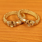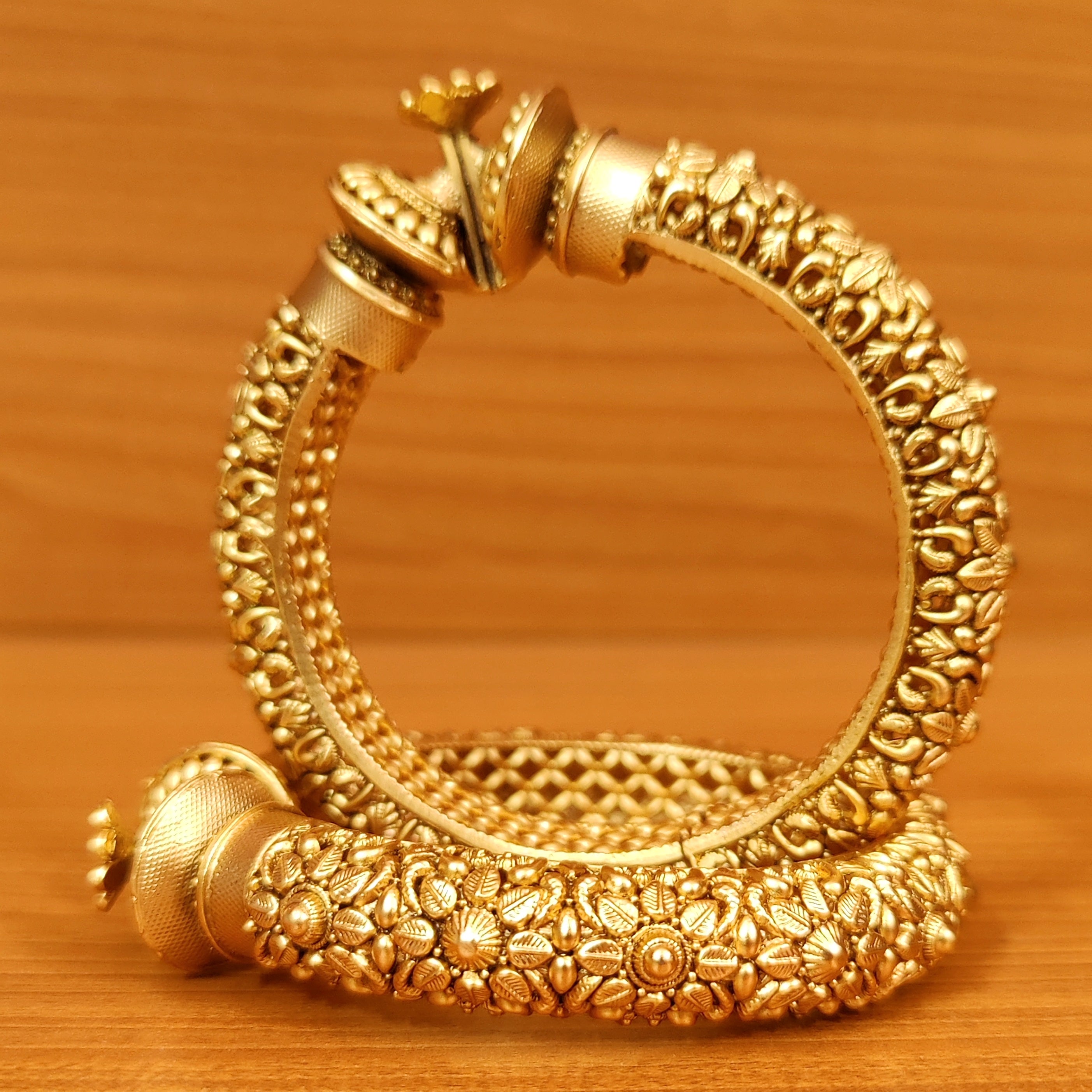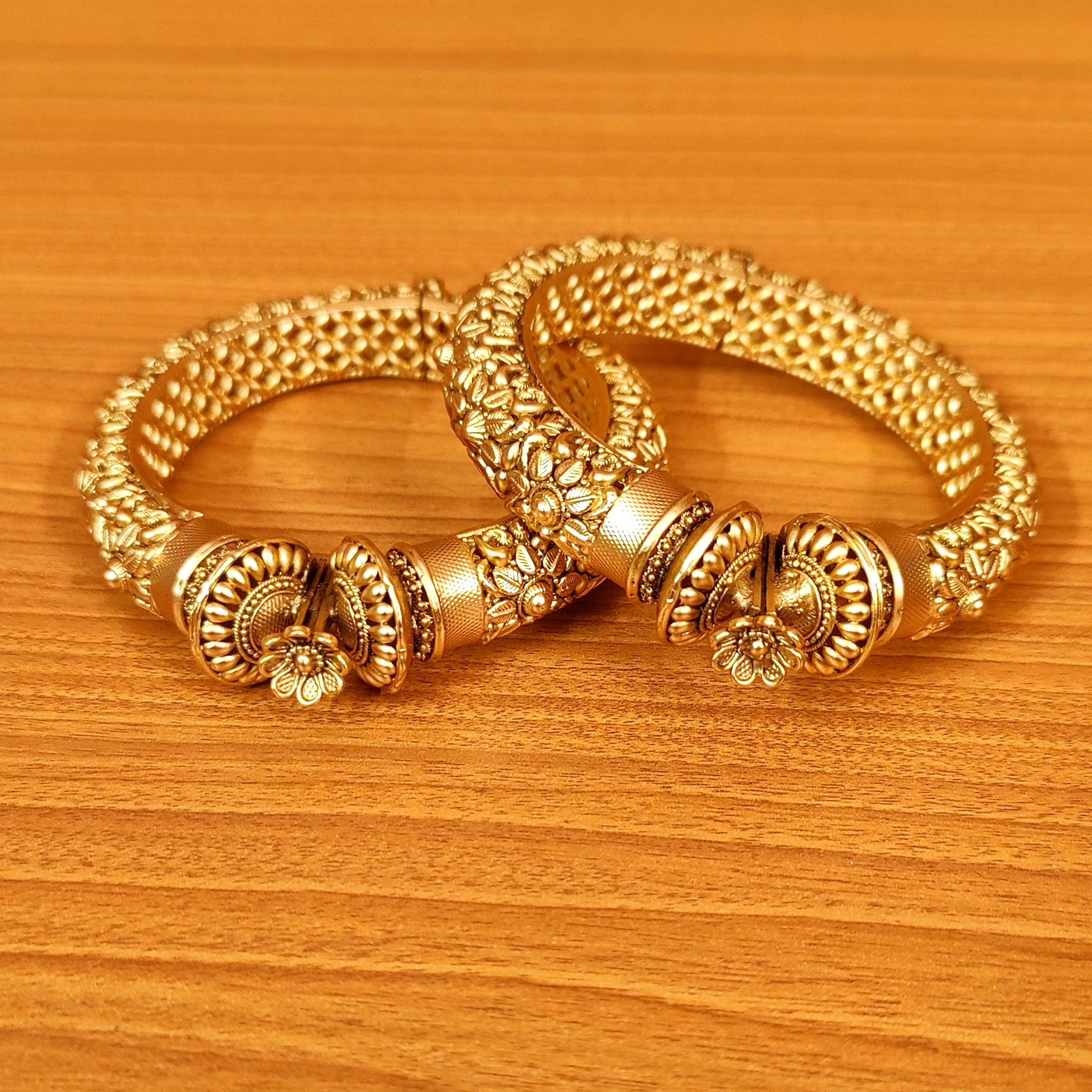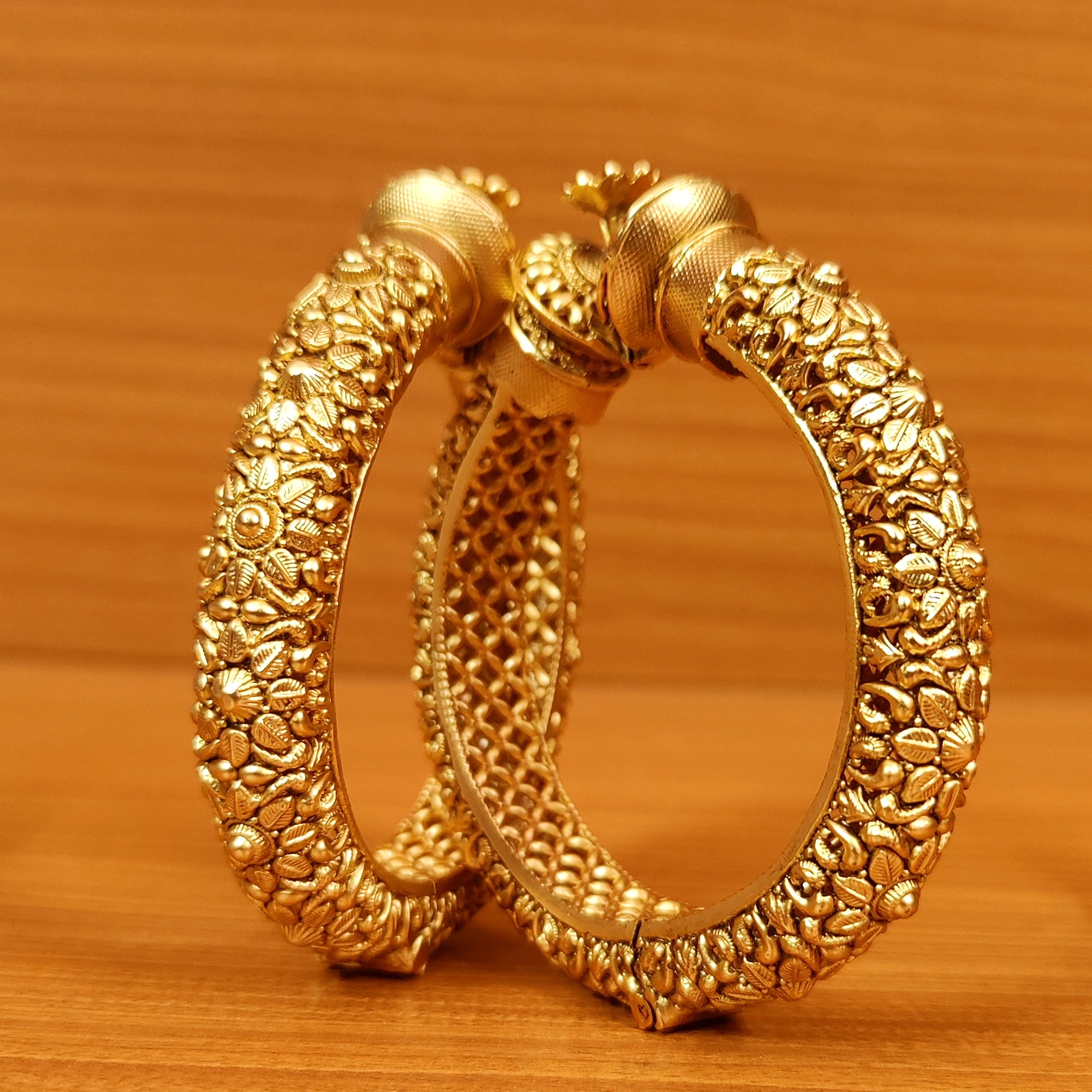 These beautiful antique matt gold bangles are handcrafted in copper alloy with intricate hand carved work in floral pattern. These bangles are coated with 22 kt matt gold plating that gives a real look to the design, these bangles are very light in weight and comes as a set of 2 bangles.