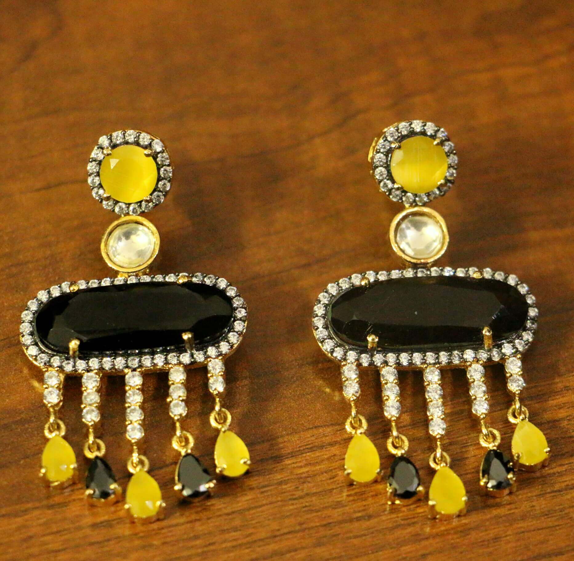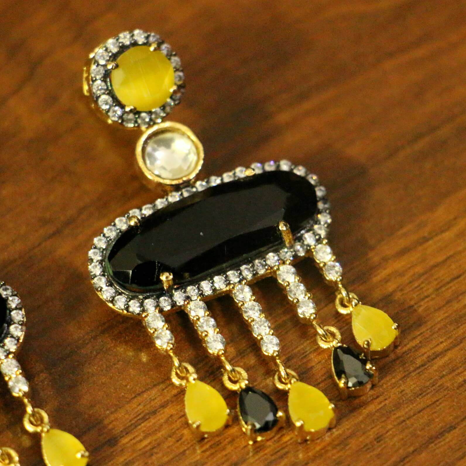 These diamond look danglers are handcrafted in silver alloy with imitation black onyx colour quartz & cz stones of very fine quality. These earrings are plated in 18kt gold rhodium plating which gives the design a real jewelry look .