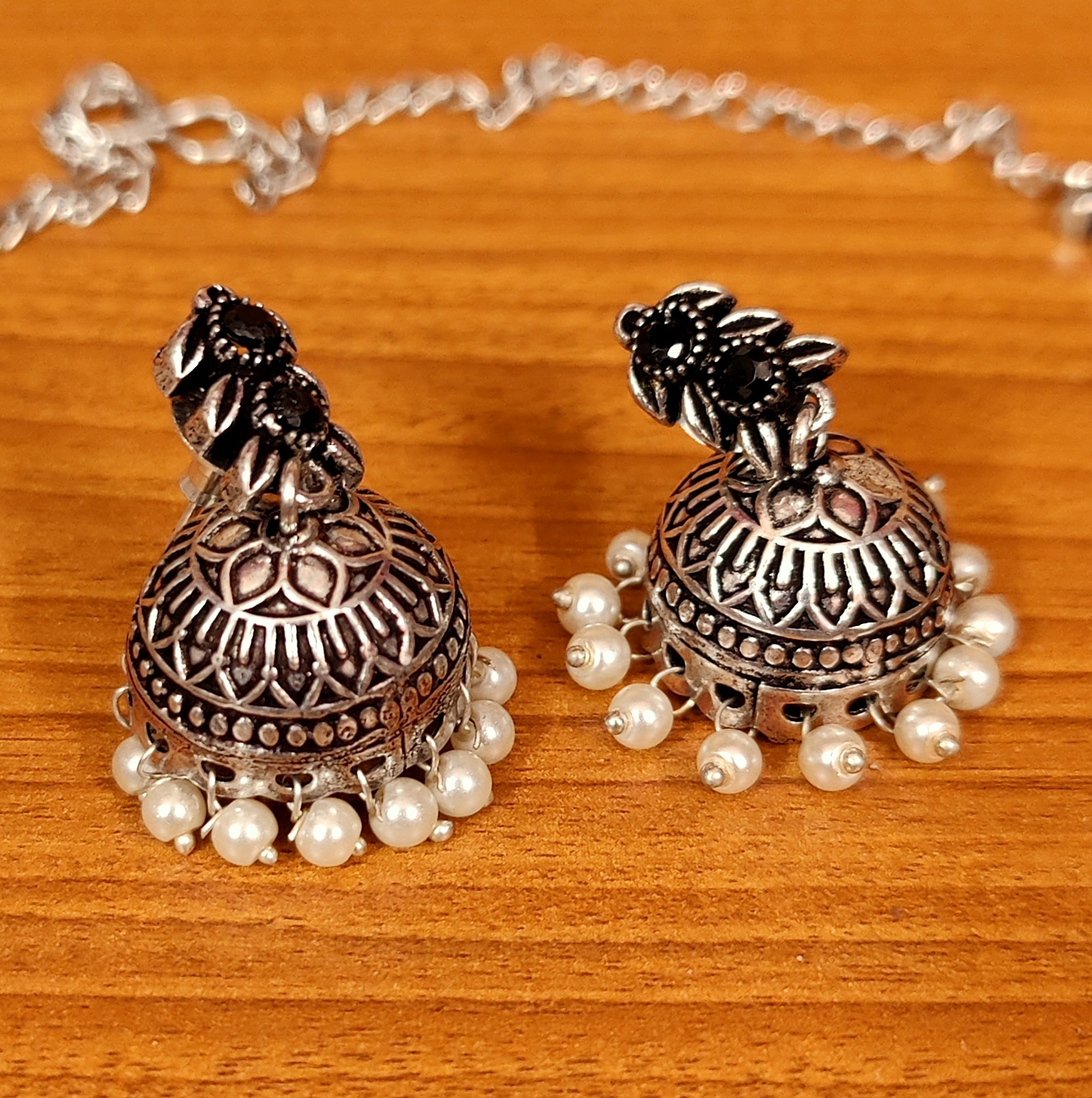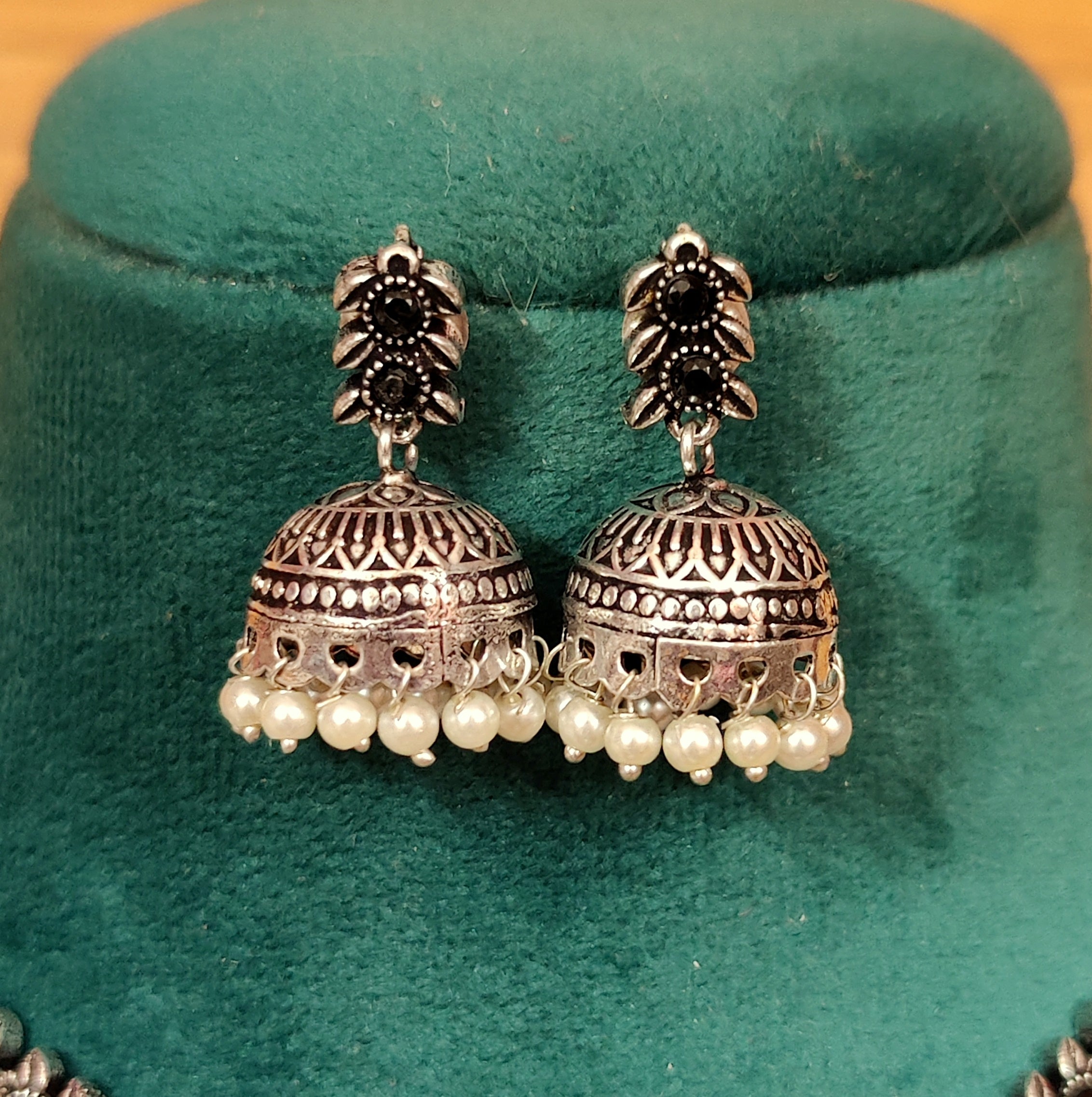 This necklace set is handcrafted in copper alloy with black colour imitation onyx stones . The plating done on the necklace set is like the same as done on the antique silver jewellery to give this set a real silver look. This necklace set comes with a pair of matching earrings which are very light in weight.