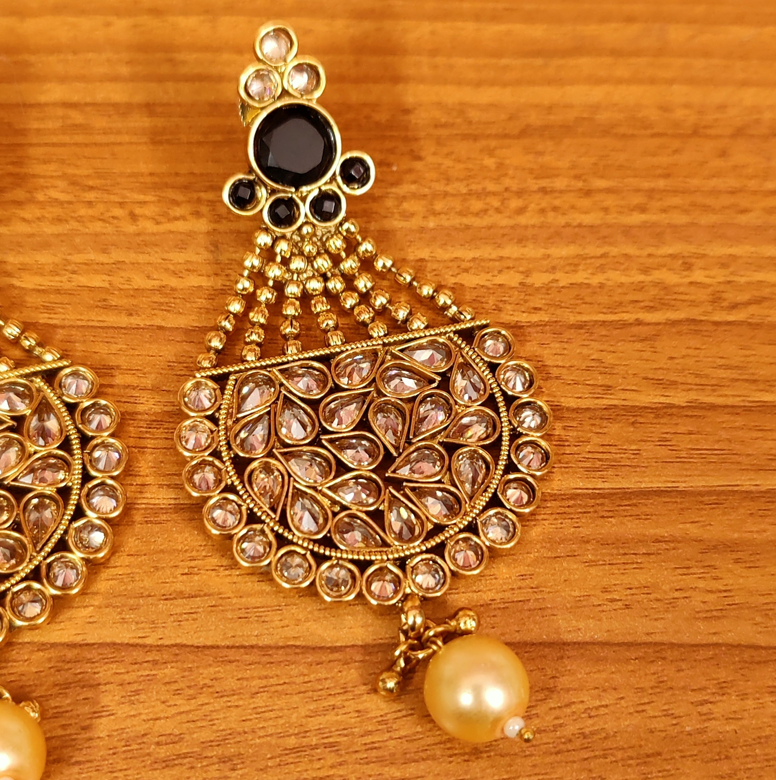 These gold look earrings are handcrafted in copper alloy with imitation black colour stones and polki stones with intricate gold work of very fine quality. These party wear earrings are plated with 18kt gold plating which gives the design a real gold look , the earrings are very light in weight and are perfect for occasional wear.