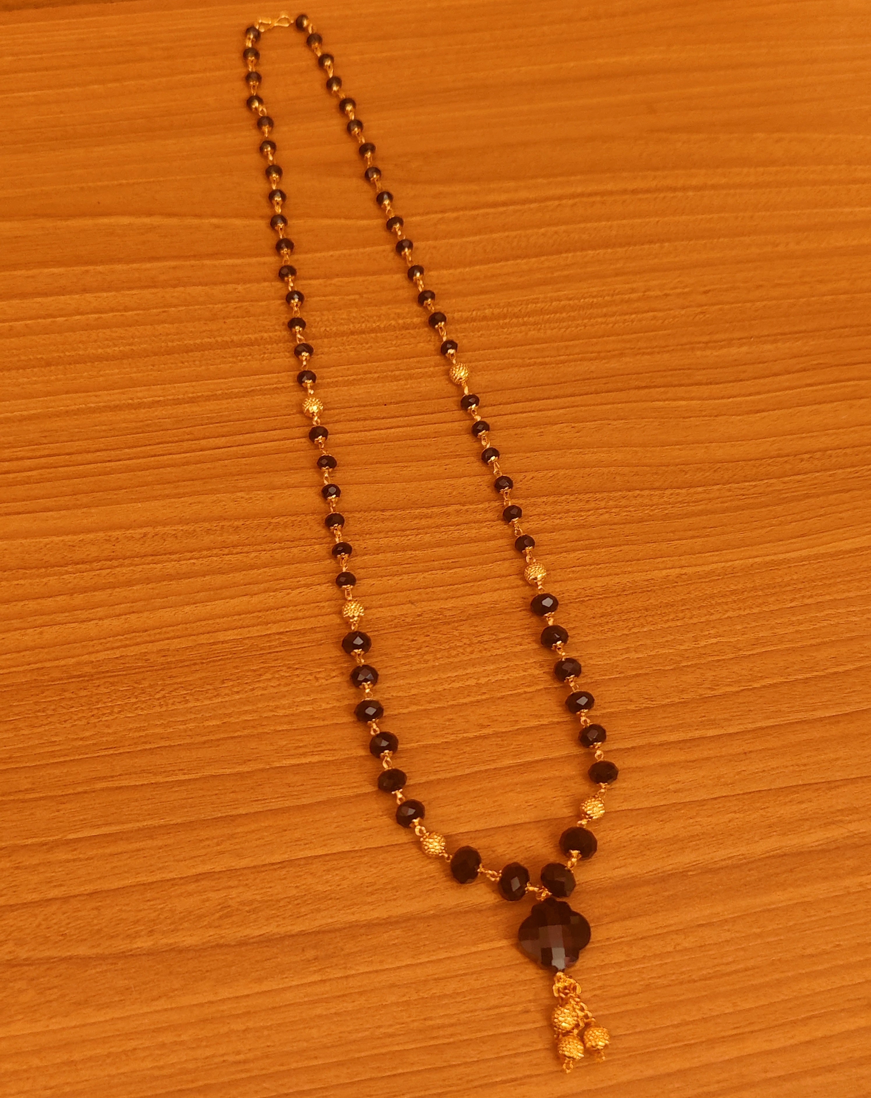 This mangalsutra is handcrafted in brass alloy with imitation black & gold beads work of very fine quality , the mangalsutra set is plated in 18kt gold plating and the design itself is perfect for wedding attires.