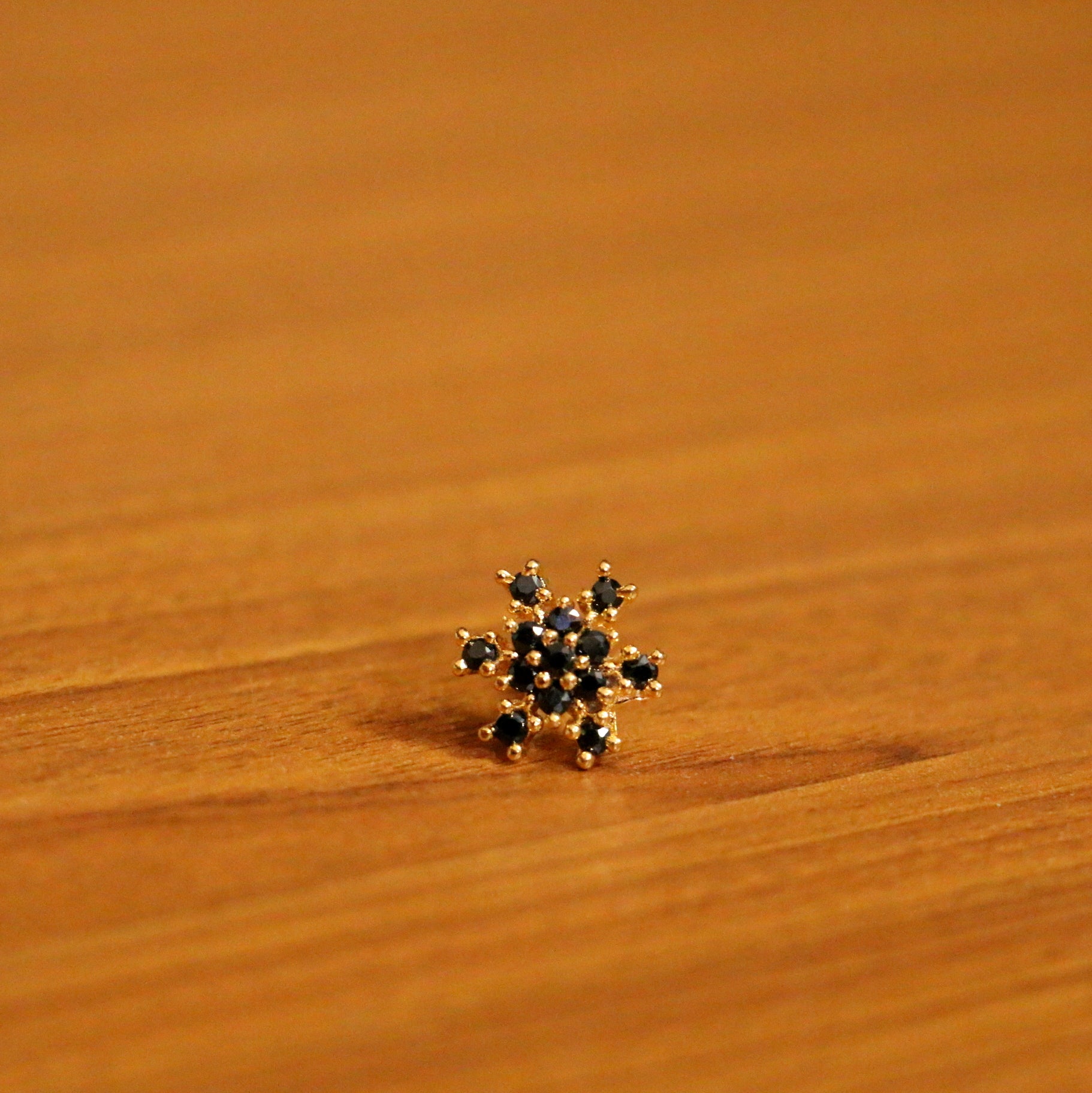 This star shaped pattern nose ring is handcrafted in silver alloy with imitation black colour cz stones of very fine quality , the nose ring is very light in weight and plated with 18kt gold rhodium to give it a real gold look.