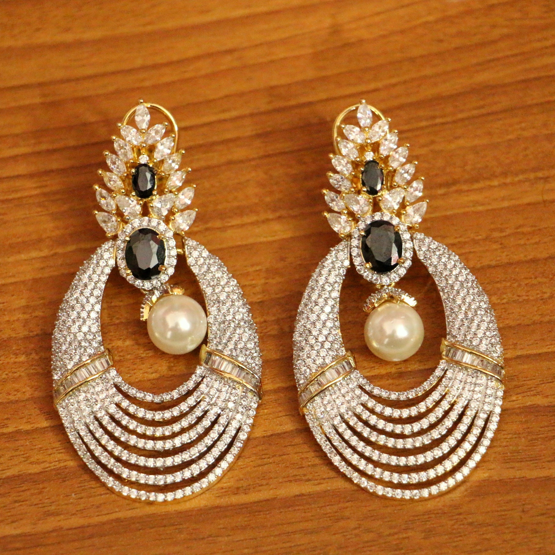 These earrings are handcrafted in silver alloy with imitation american diamond work of very fine quality. These artistic yet modern earrings are plated with high quality gold rhodium. The earrings are very light in weight.