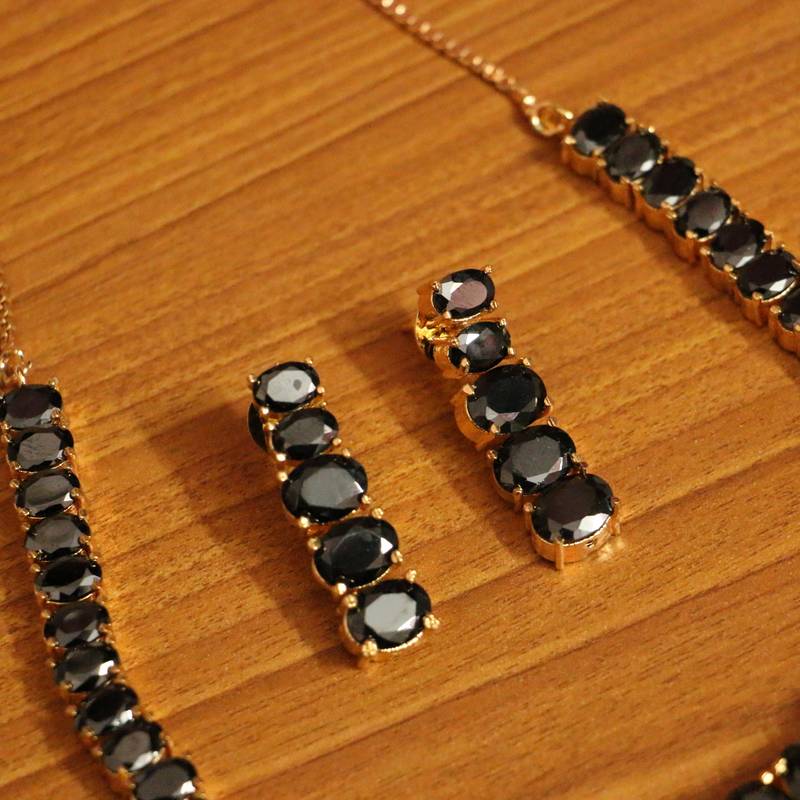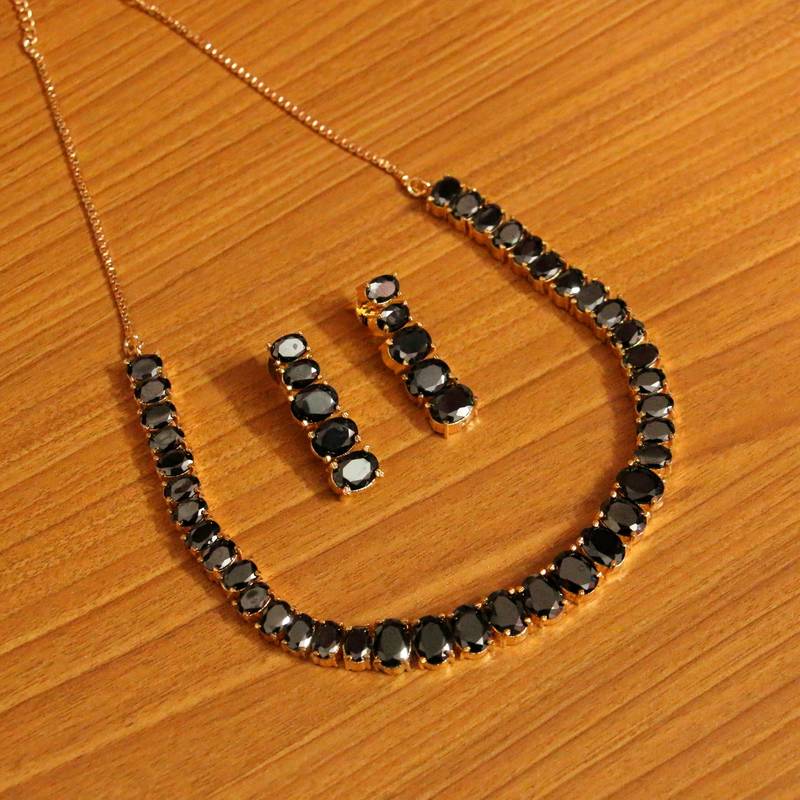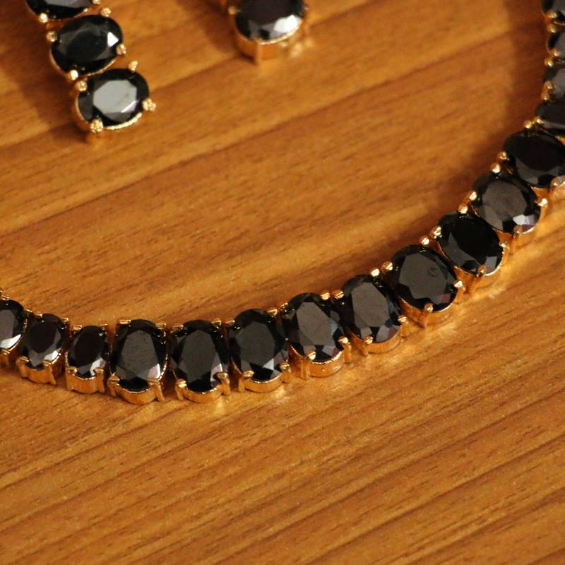 This Oval Shaped Black Colour Necklace Set Is Handcrafted In Silver Alloy With Imitation Black Onyx Colour Stones In Oval Shape Of Very Fine Quality . This Necklace Set Is Coated With 18kt Gold Rhodium Plating That Gives A Real Gold Look . An Absolutely Stunning Piece To Own And Are Light In Weight.
