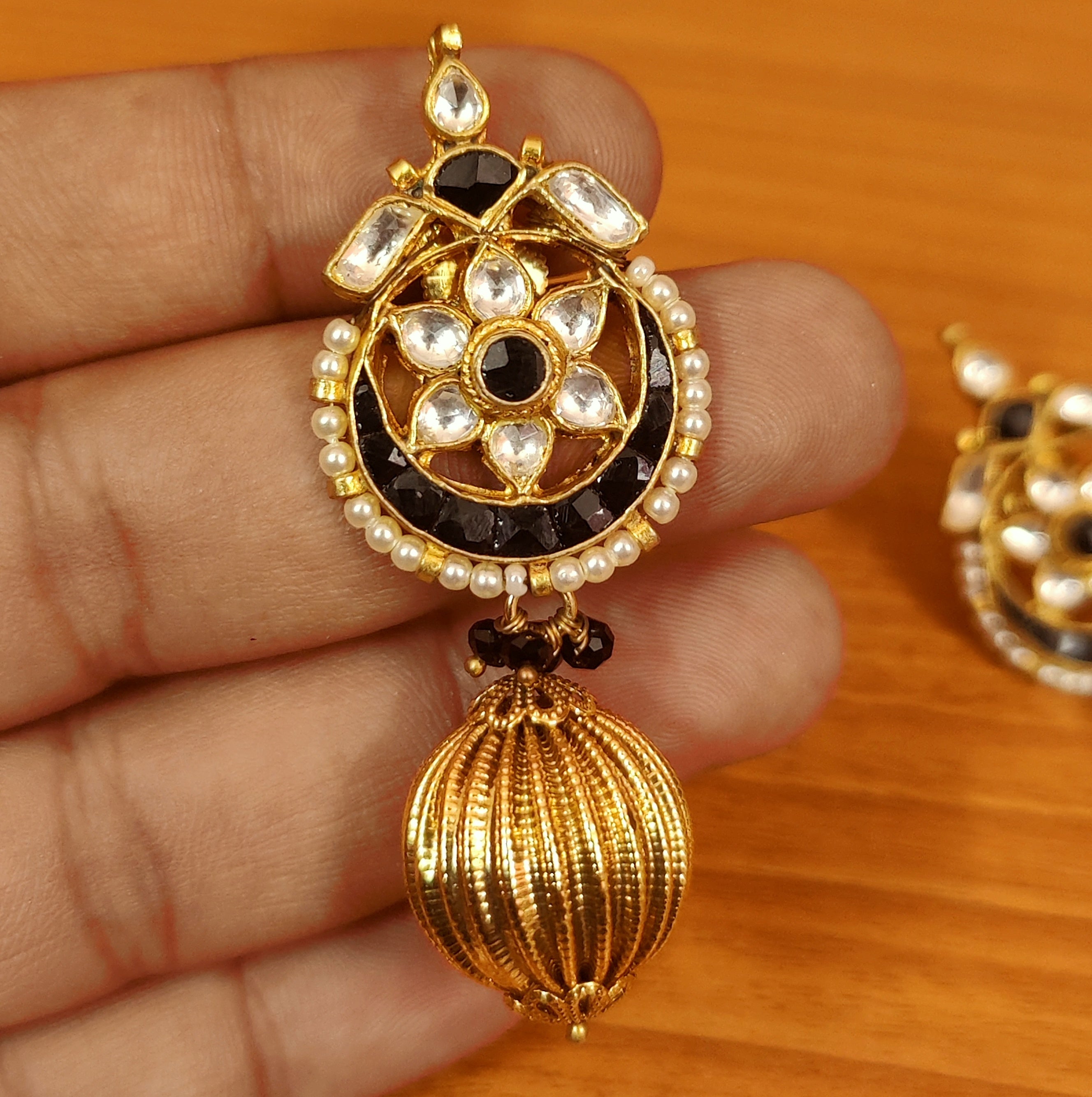 These pachi kundan handmade danglers are handcrafted in copper alloy with imitation black onyx stones & uncut imitation kundan stones of fine quality. These artistic yet modern earrings are plated with fine nickle free gold rhodium to avoid any allergies to the skin.