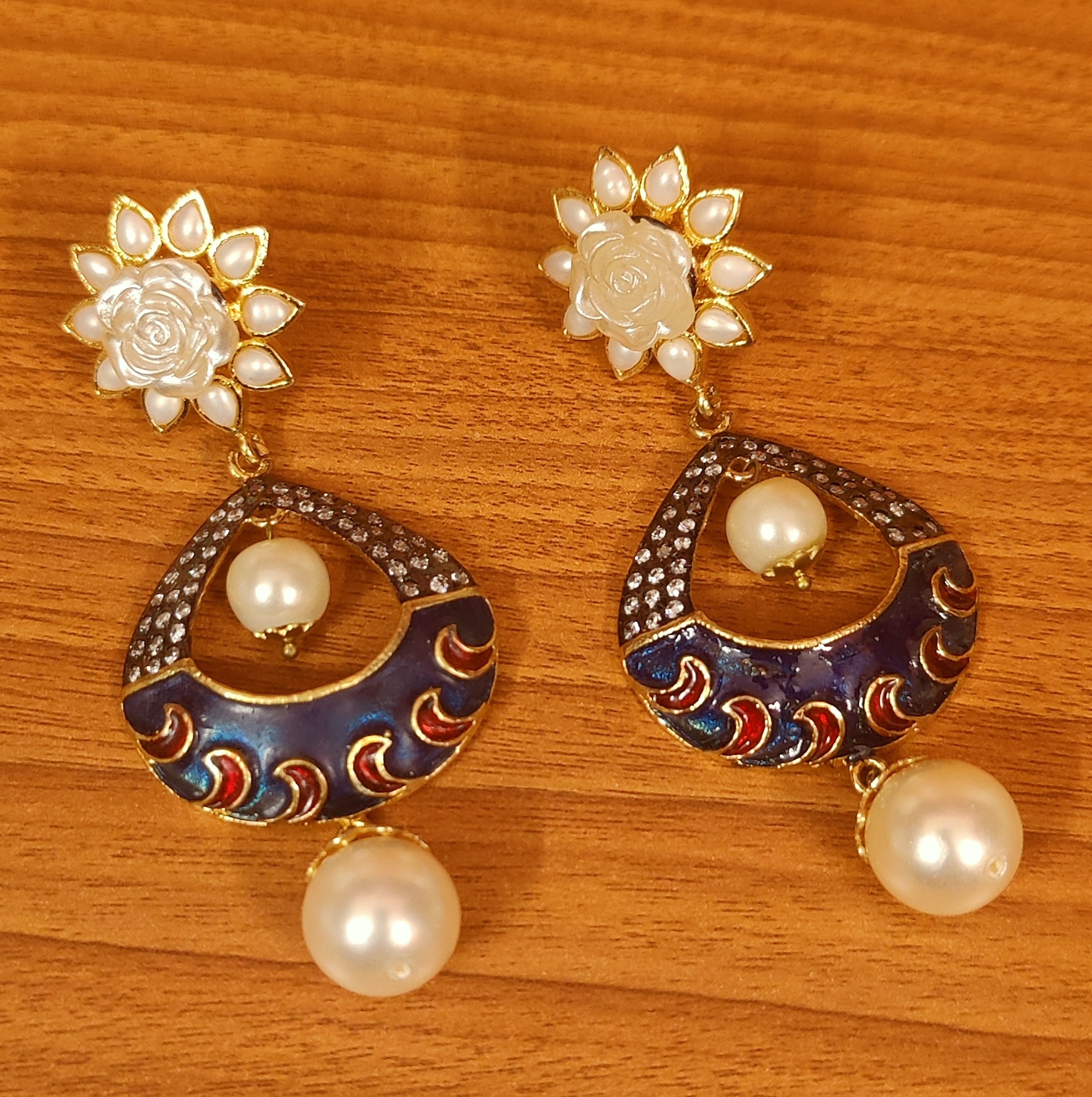 These meenakari work earrings are handcrafted in silver alloy with imitation pearls and american diamonds of very fine quality. These party wear gold look earrings are plated with 18kt antique gold plating which gives the design a real gold look , the earrings are light in weight and are perfect for occasional wear.
