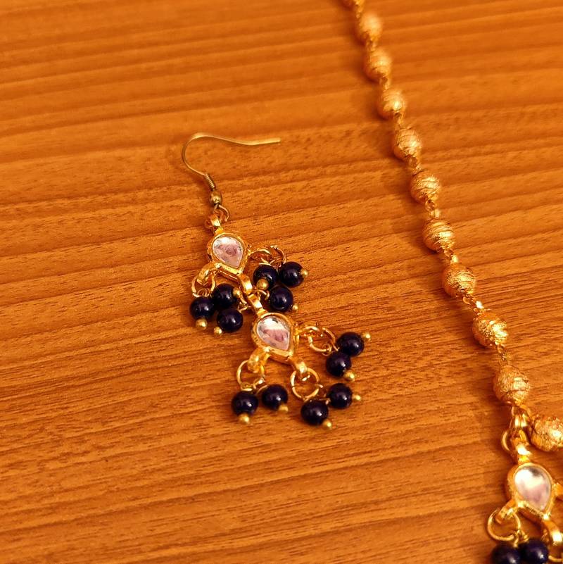 This Kundan Polki Necklace Set Is Handcrafted In copper Alloy With Imitation dark blue colour beads And Kundan Polki Stones Of Fine Quality , The Necklace Set Is Plated In 18kt Gold Plating And The Design Itself Is Perfect For Wedding Attires.