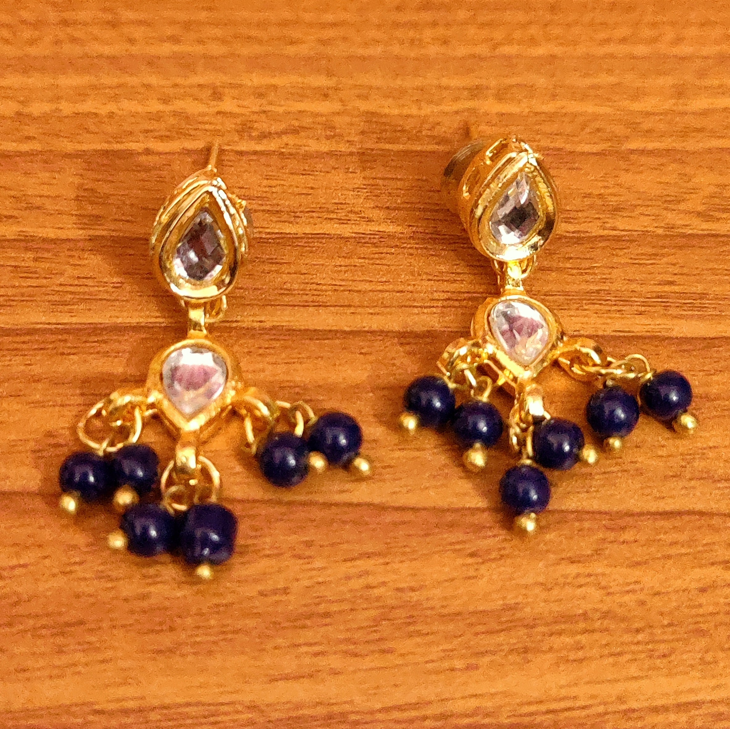These kundan polki studs are handcrafted in brass alloy with imitation blue colour pearls of very fine quality. these artistic yet modern studs are plated with high quality gold rhodium. the earrings are very light in weight.