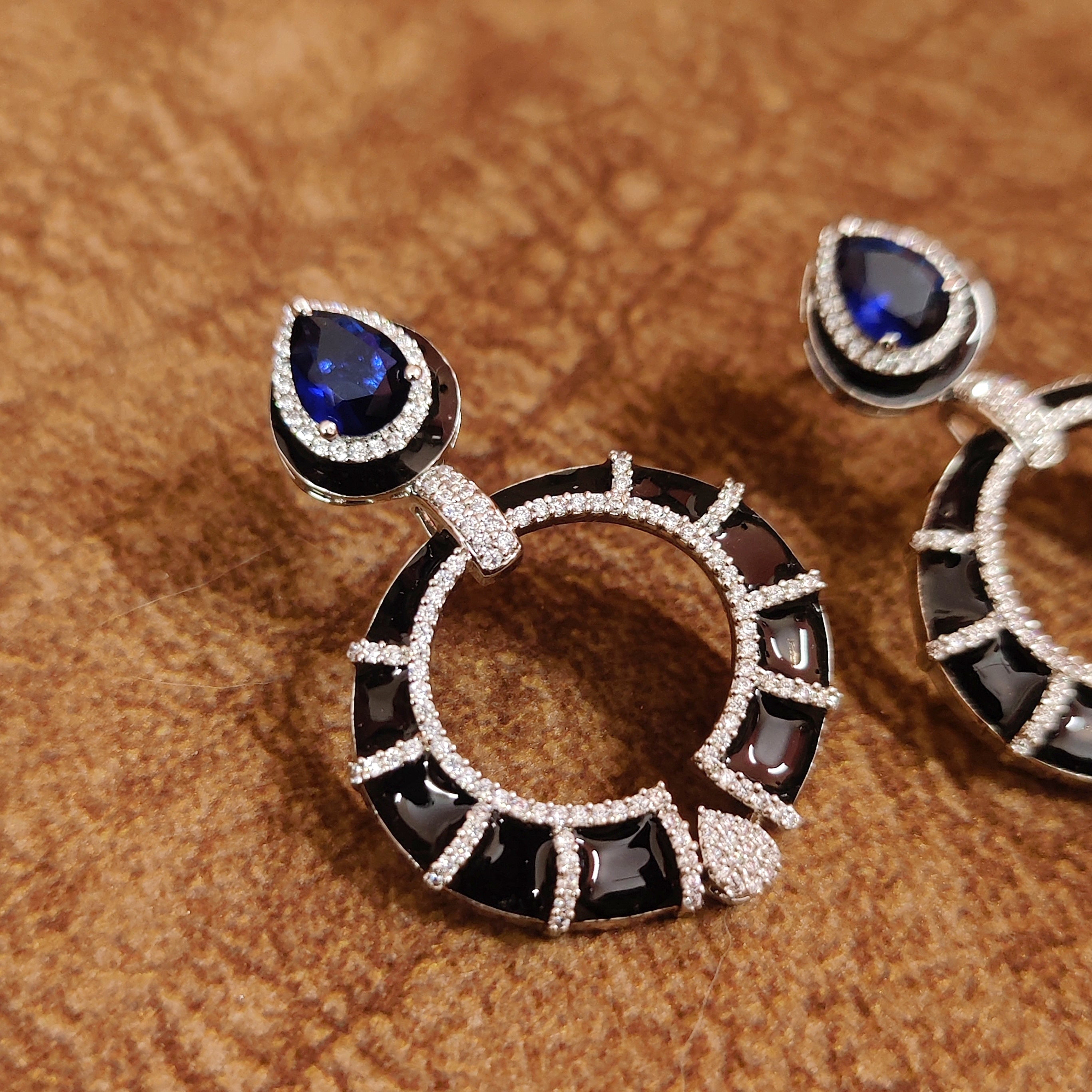 Add a touch of elegance to your outfit with our stunning Blue Sapphire Danglers. These earrings feature vibrant blue sapphire colour cz stones paired with the finest quality american diamond. The intricate meenakari work adds a unique touch to the modern design. Made with lightweight silver plating, they are perfect for any occasion.
