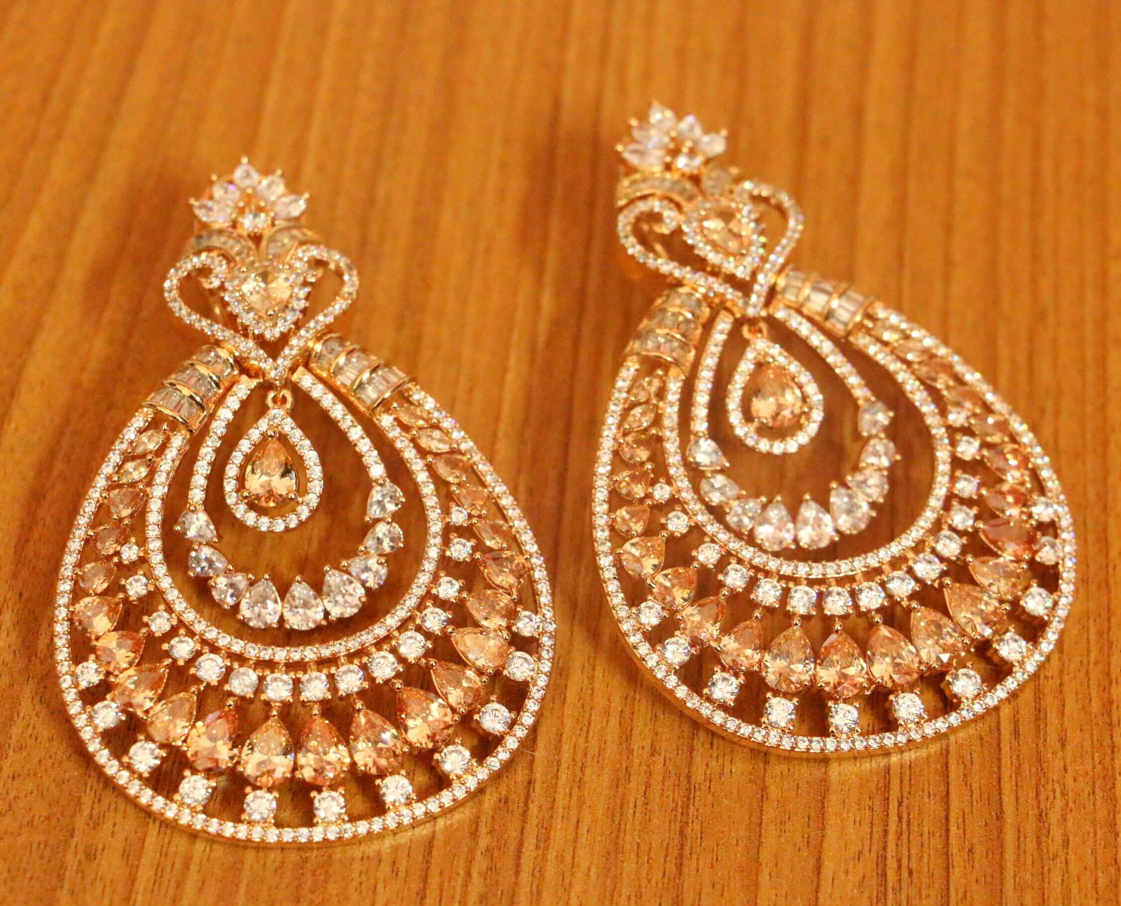 These diamond look danglers are handcrafted in silver alloy with imitation citrine colour quartz & cz stones of very fine quality. These earrings are plated in 18kt rose gold rhodium plating which gives the design a real jewelry look .