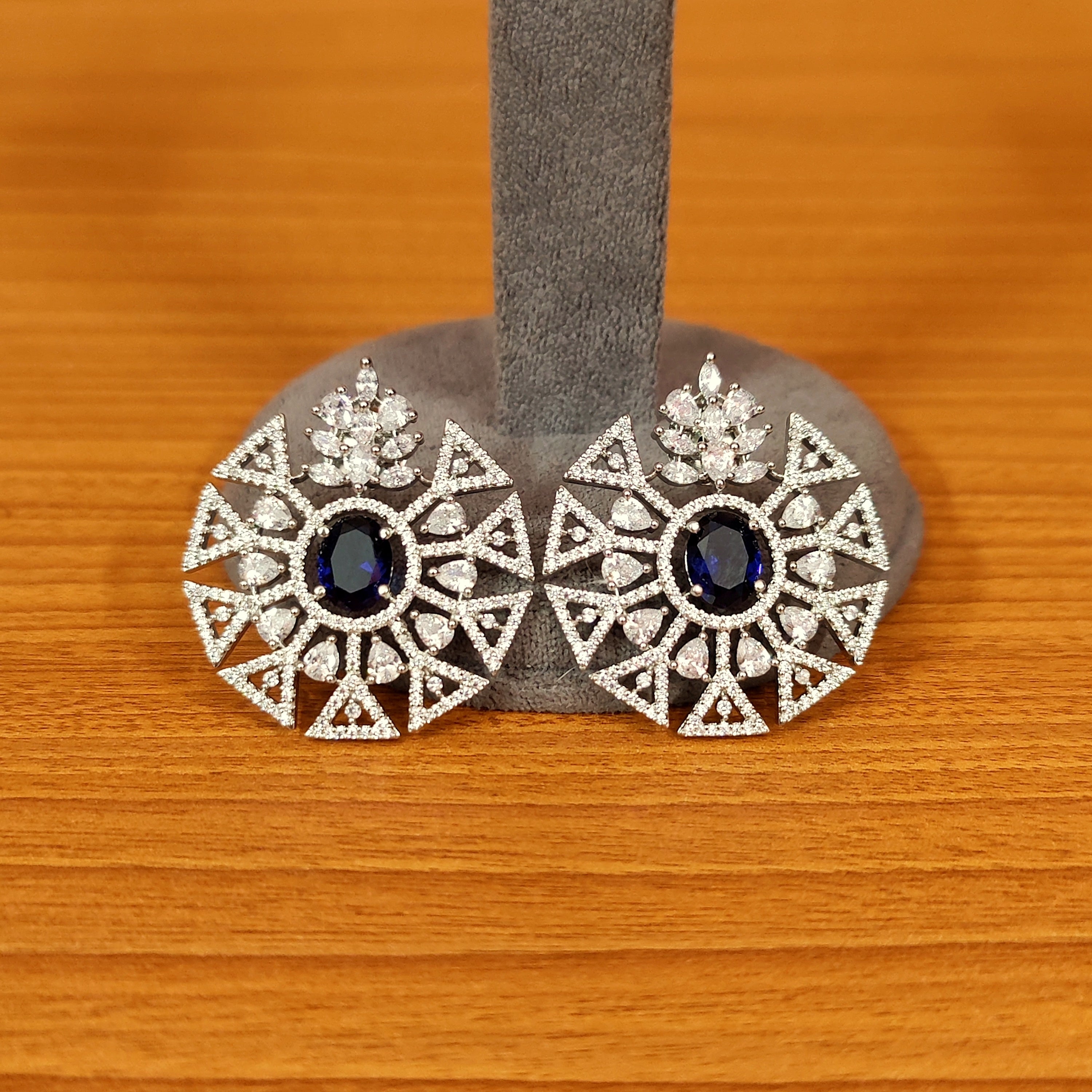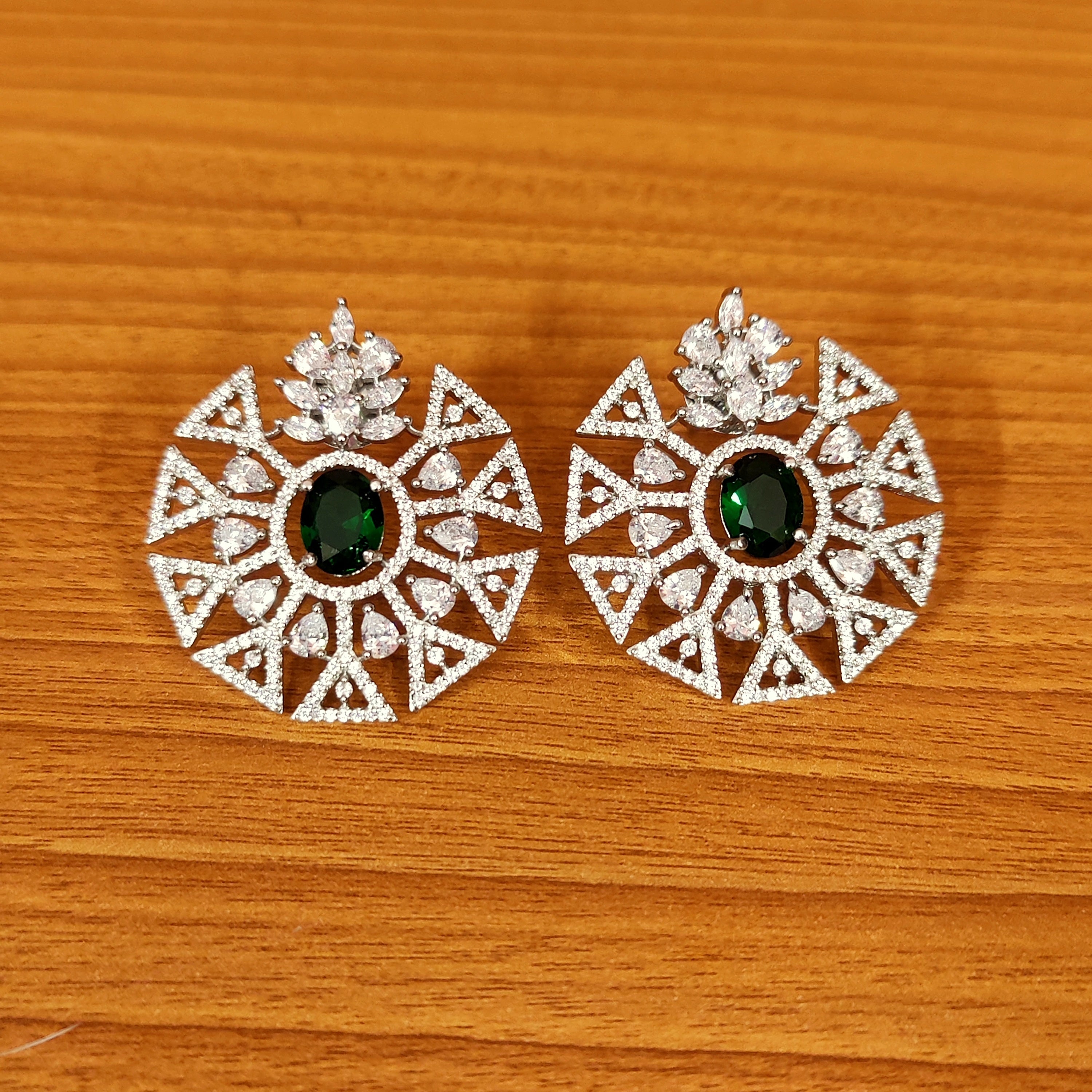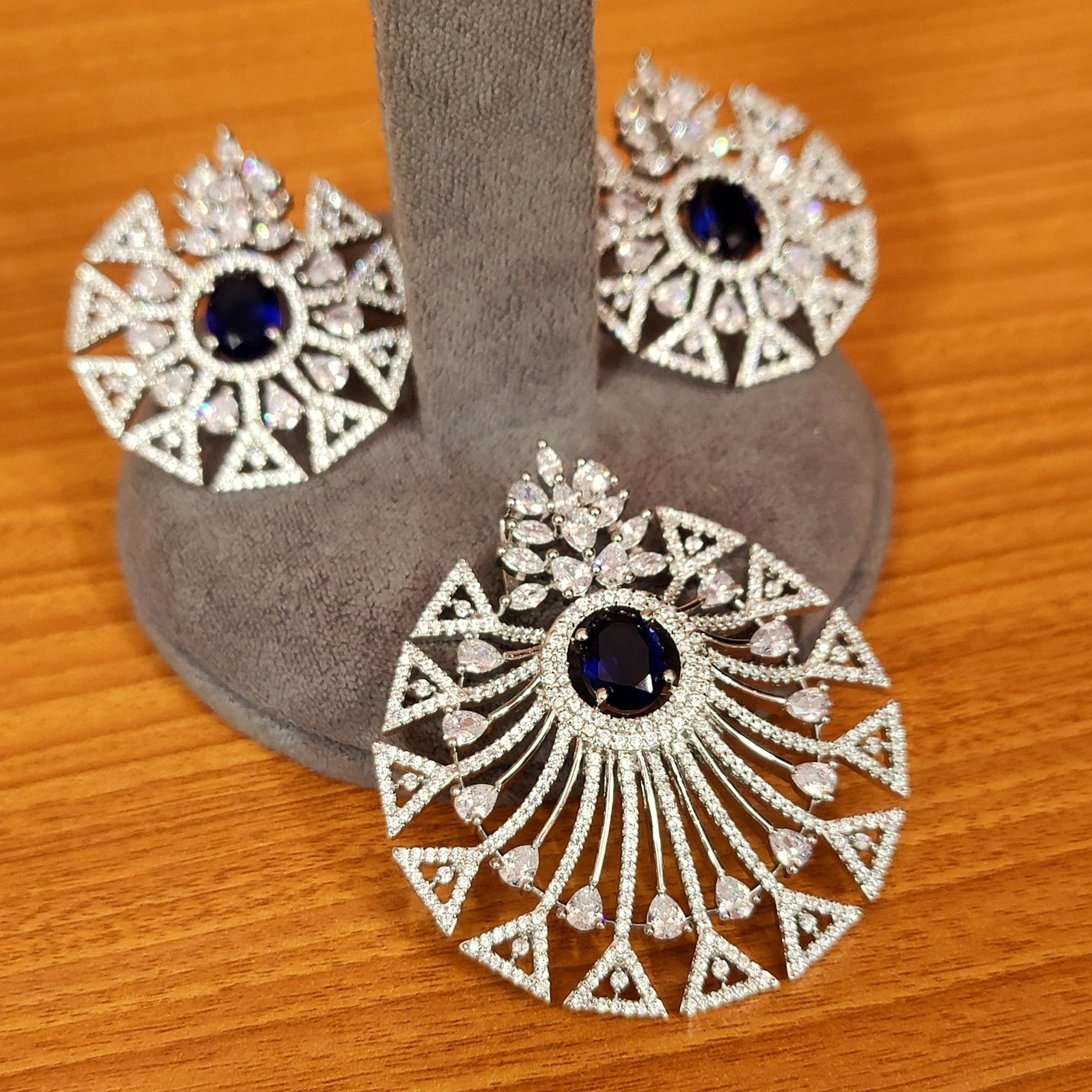This diamond look pendant set is made in silver alloy with imitation emerald colour bottle green cz stone & american diamond stones of extremely fine quality. This gorgeous pendant set is handcrafted to perfection with superior quality coloured & cz stones and is plated with 18kt nickle free white gold rhodium that gives the design a real diamond look & comes with a matching pair of big size earrings which are absolutely gorgeous and are very light in weight.