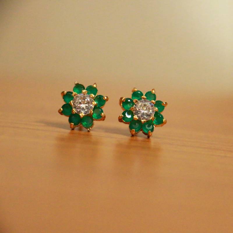 These studs are handcrafted in silver alloy with imitation green emerald colour stones of very fine quality. These artistic yet modern studs are plated with high quality gold rhodium. The earrings are very light in weight.