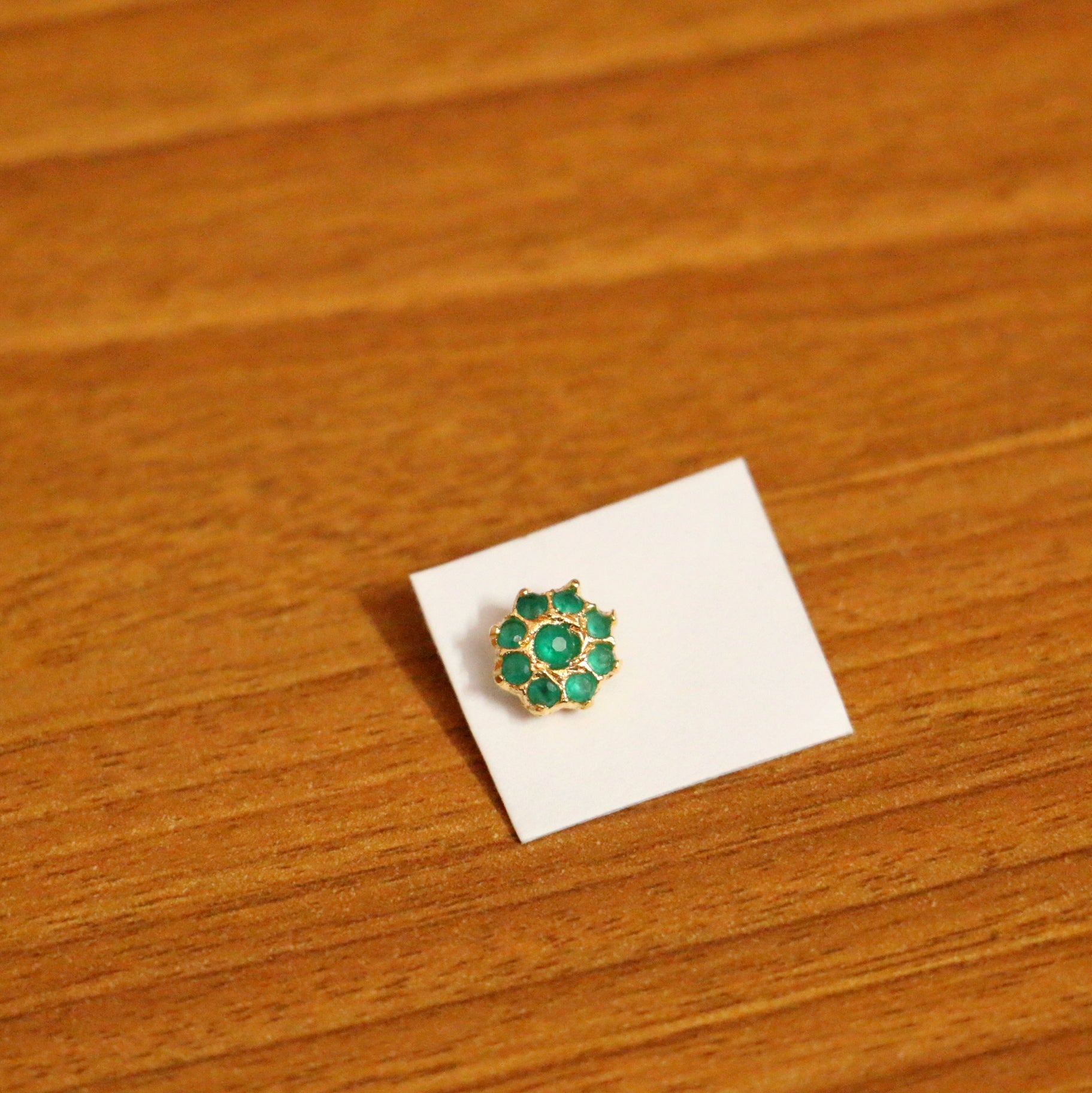This flower look nose ring is handcrafted in silver alloy with imitation emerald look stones of very fine quality , the nose ring is very light in weight and plated with 18kt gold rhodium to give it a real gold look.