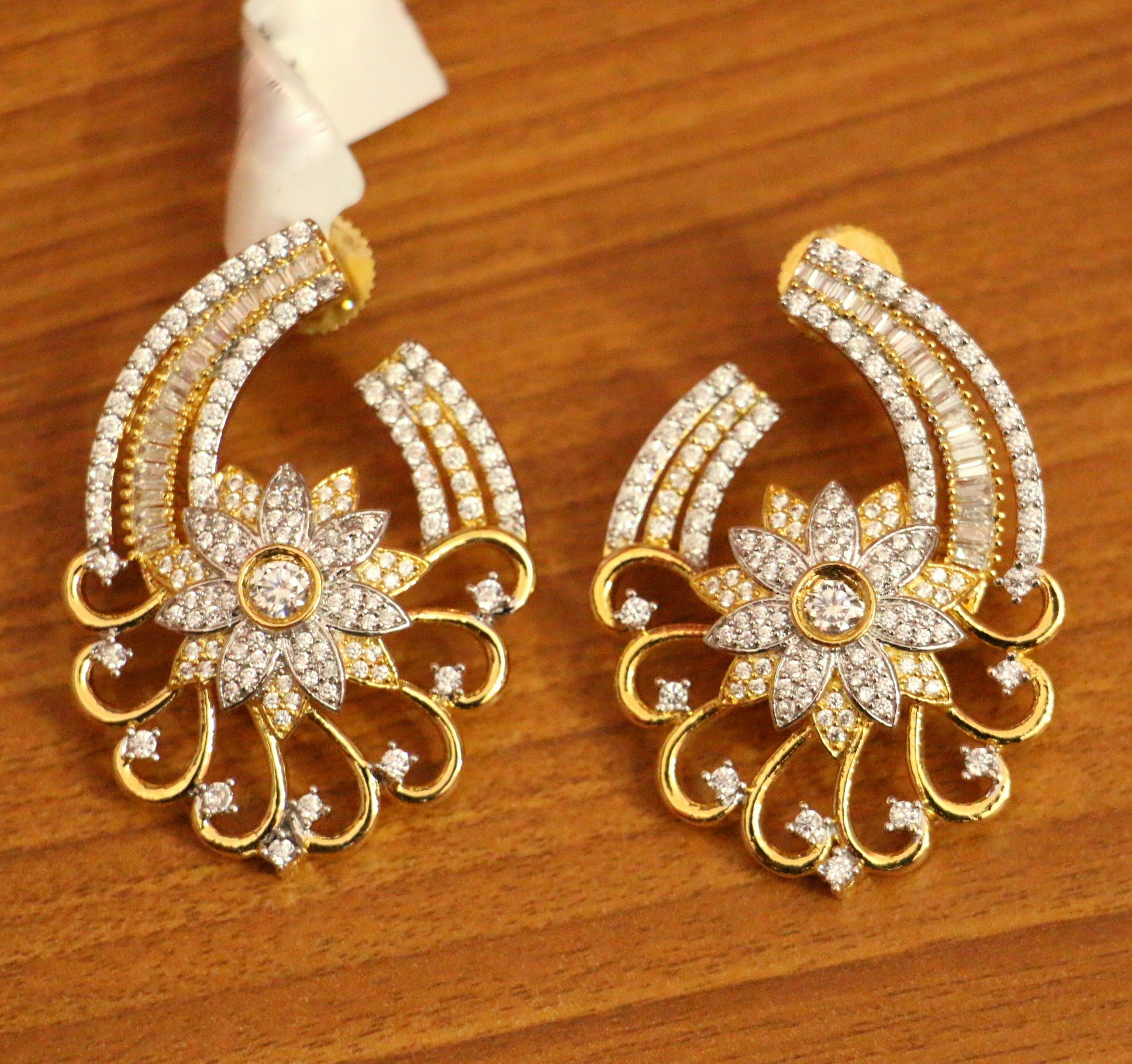 These earrings are handcrafted in silver alloy with imitation american diamond work of very fine quality. These artistic yet modern earrings are plated with high quality gold rhodium. The earrings are very light in weight.