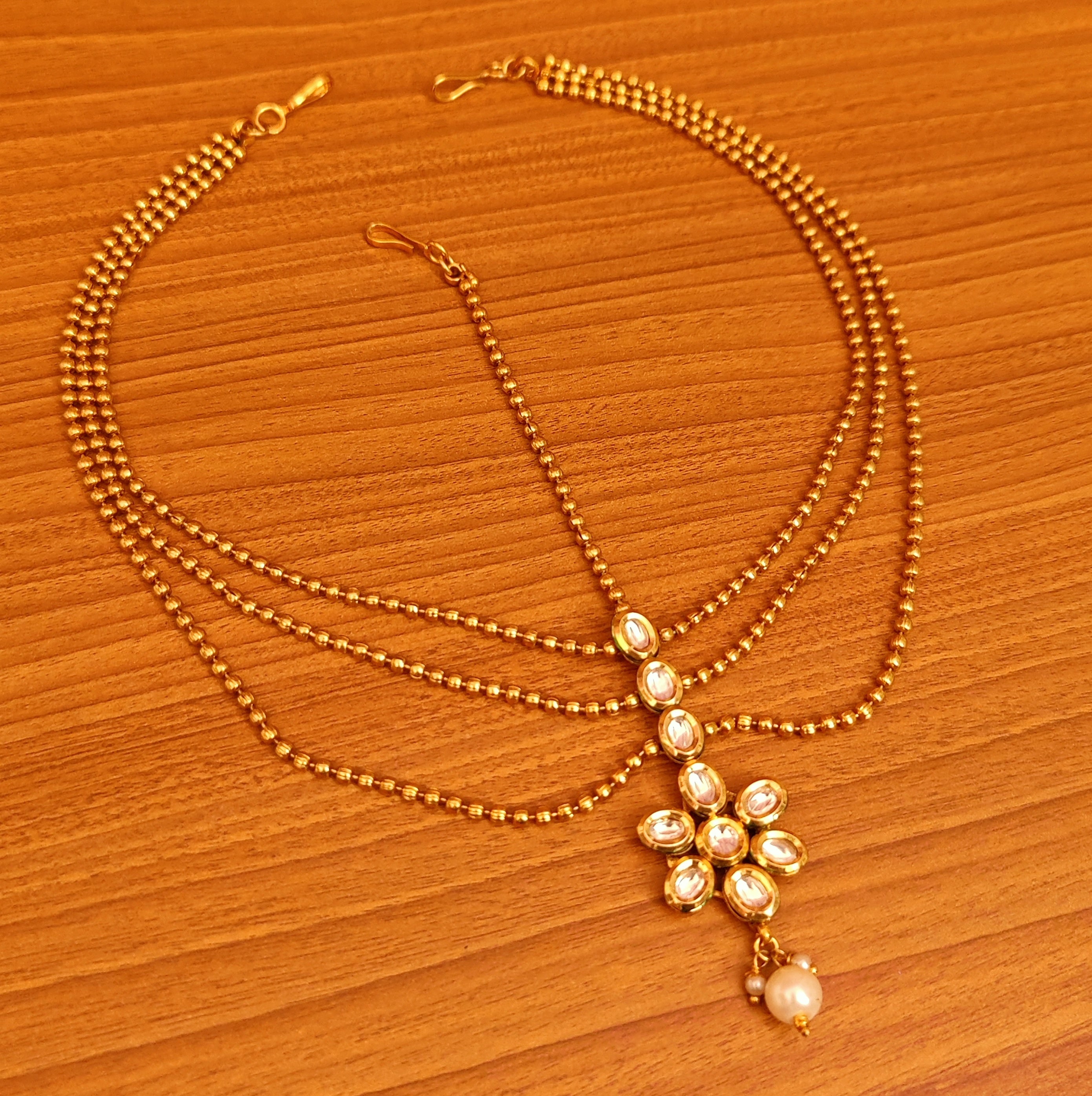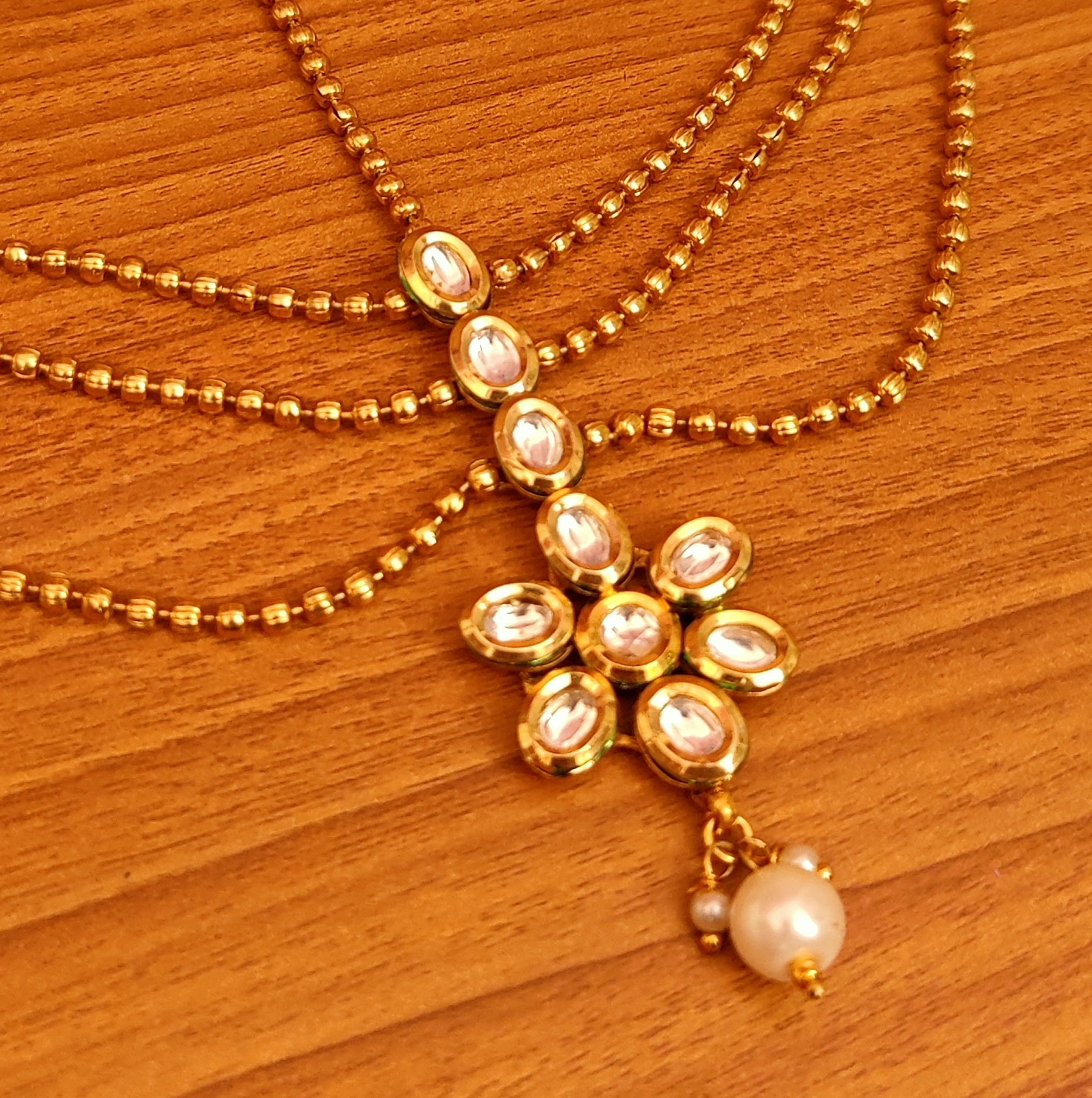 FLOWER KUNDAN POLKI GOLD CHAIN LOOK BRIDAL MAANG TIKKA