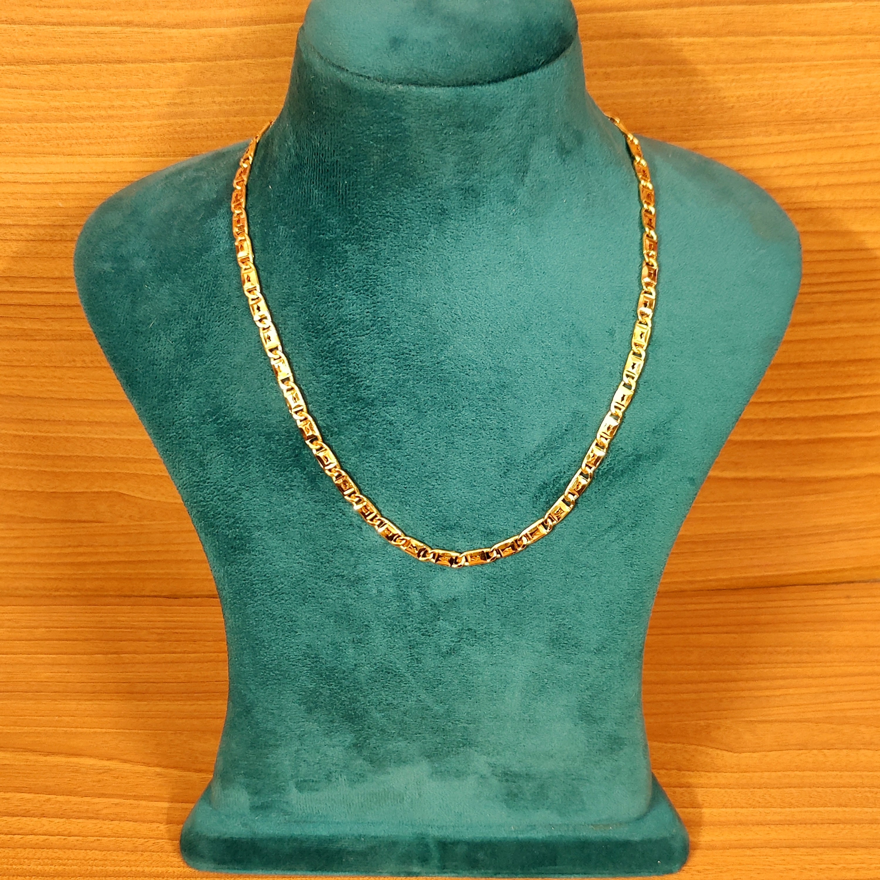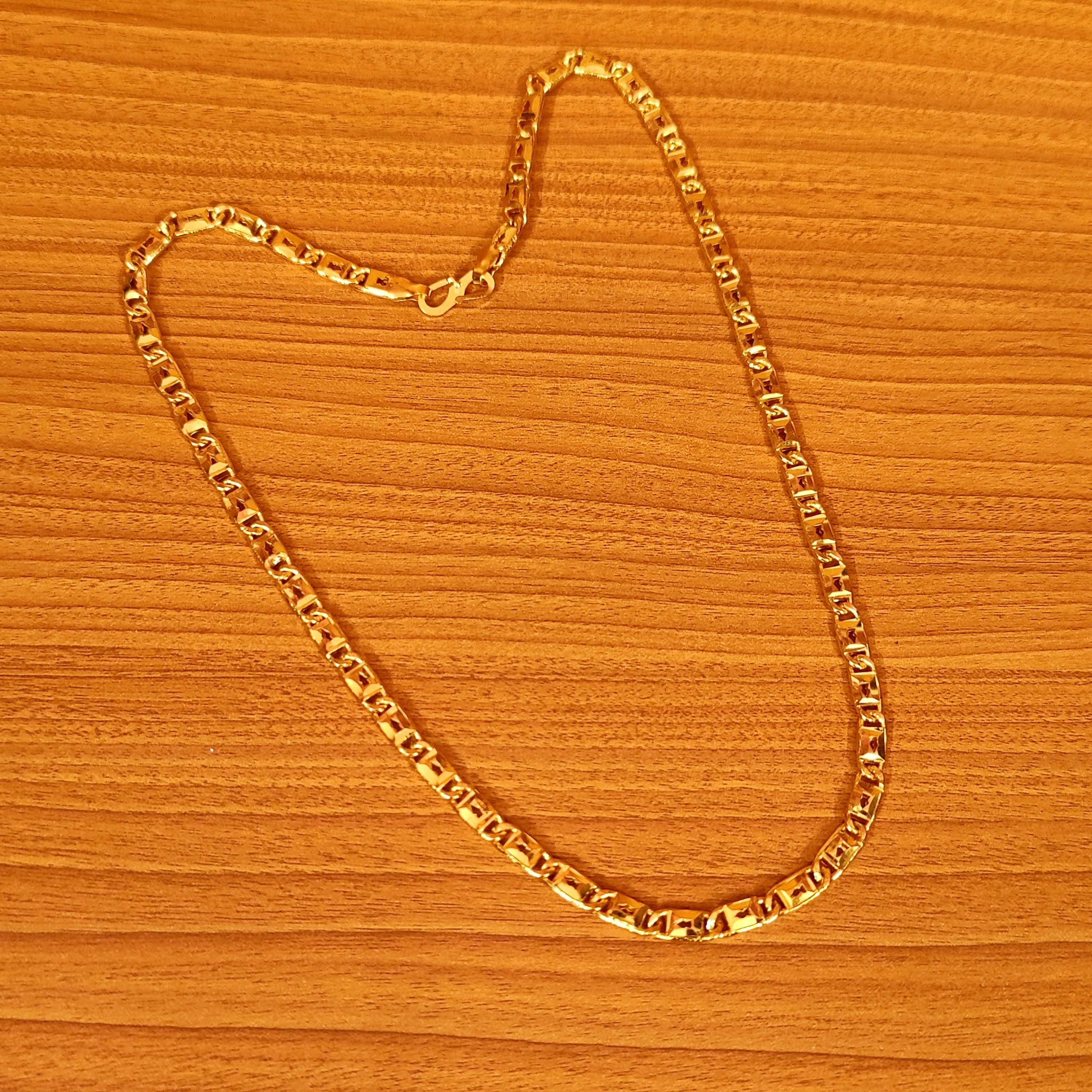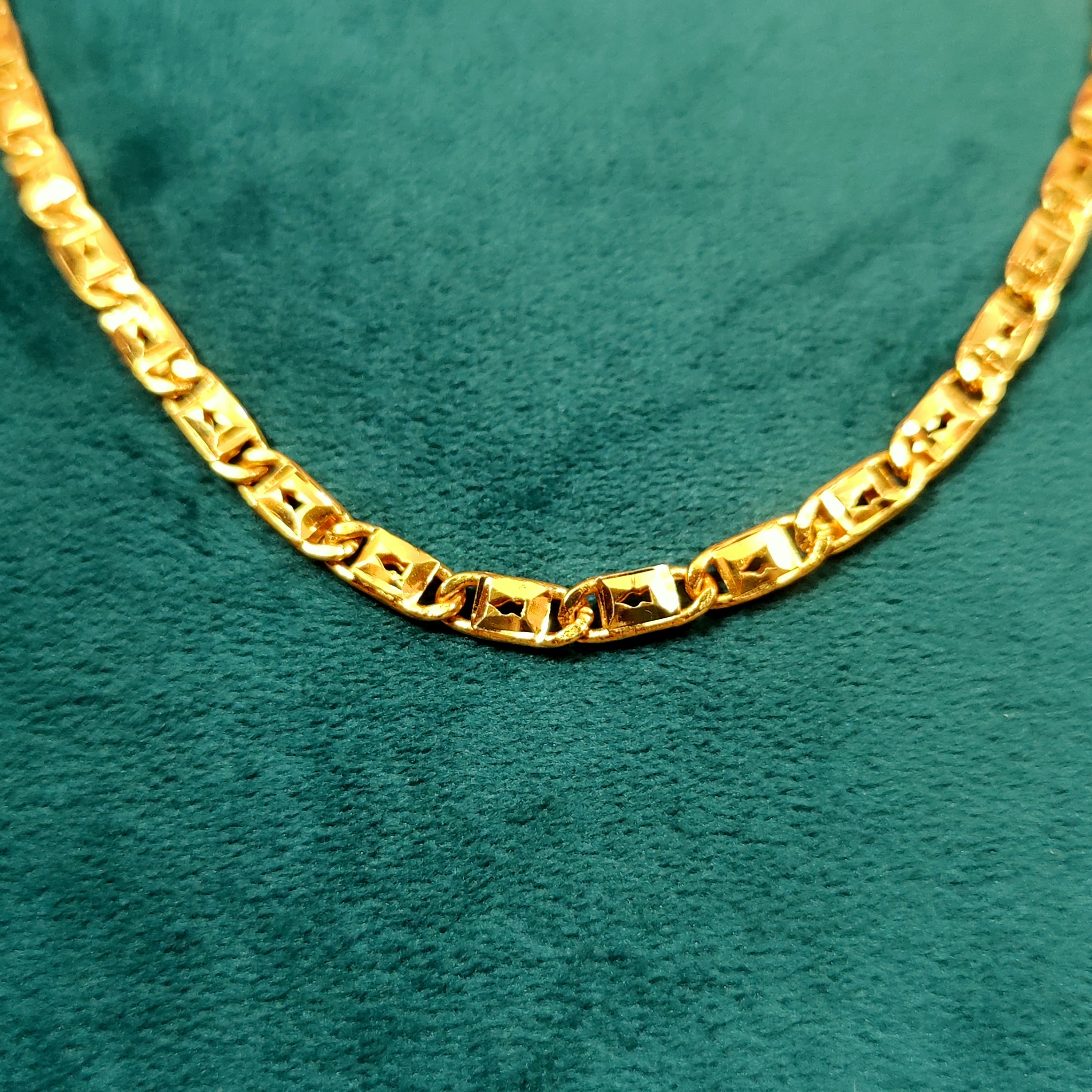 This gold look pattern men's chain is handcrafted in copper alloy with 18kt gold rhodium plating to give it a real gold look .