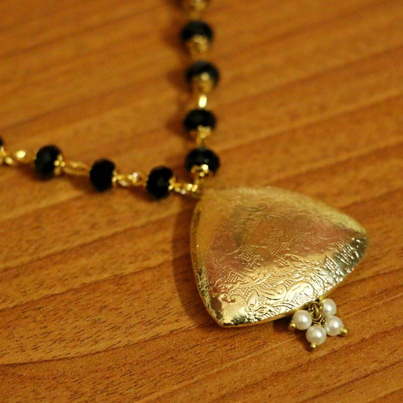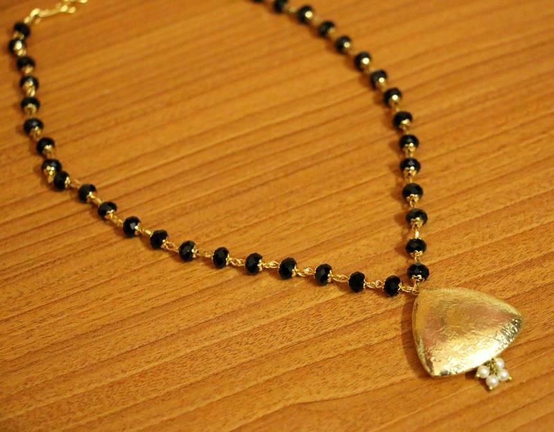 This beautiful mangalsutra is handcrafted in brass alloy with imitation gold look bead work of very fine quality . This mangalsutra is coated with 18 kt gold polish which give them a unique look . An absolutely stunning piece to own and are very light in weight.