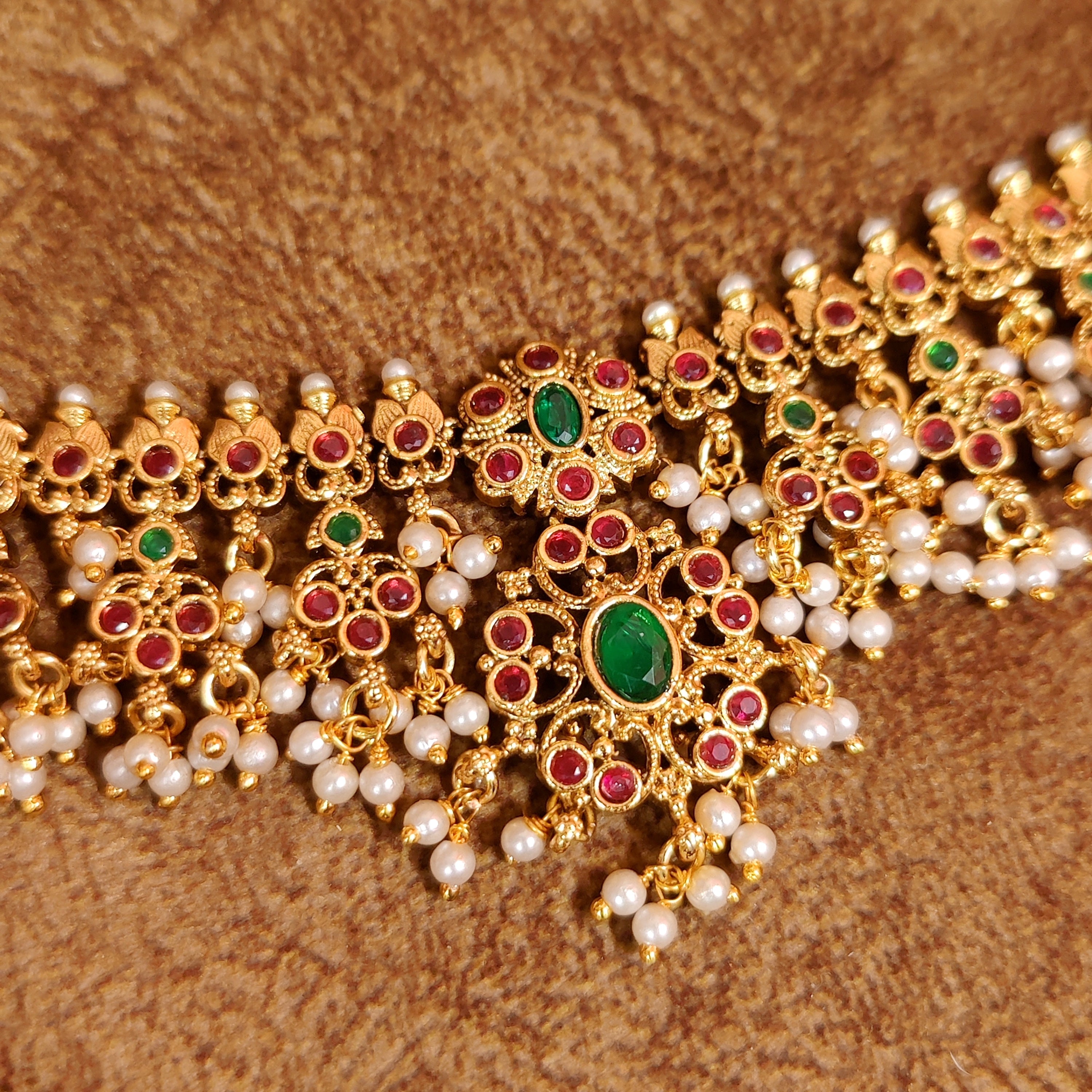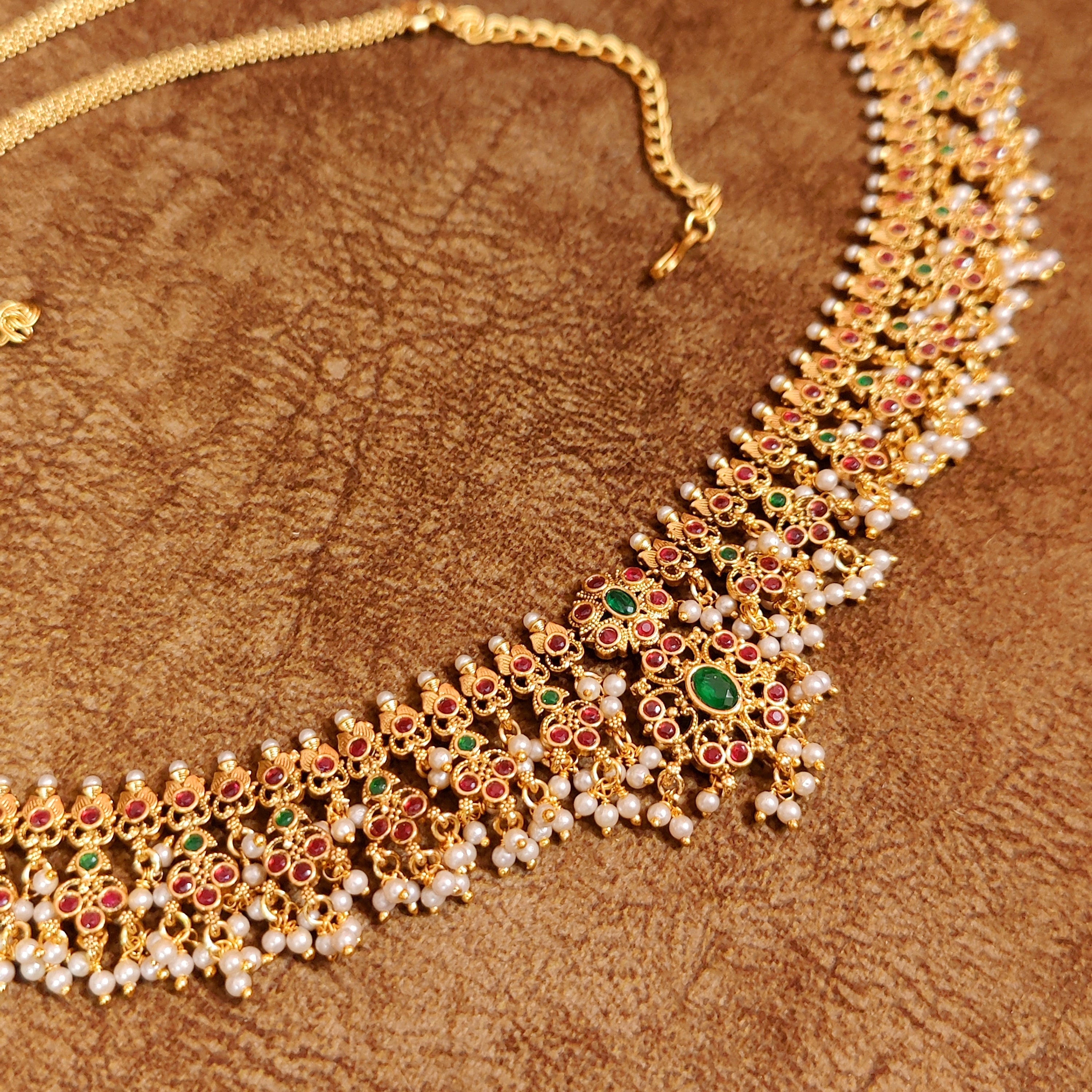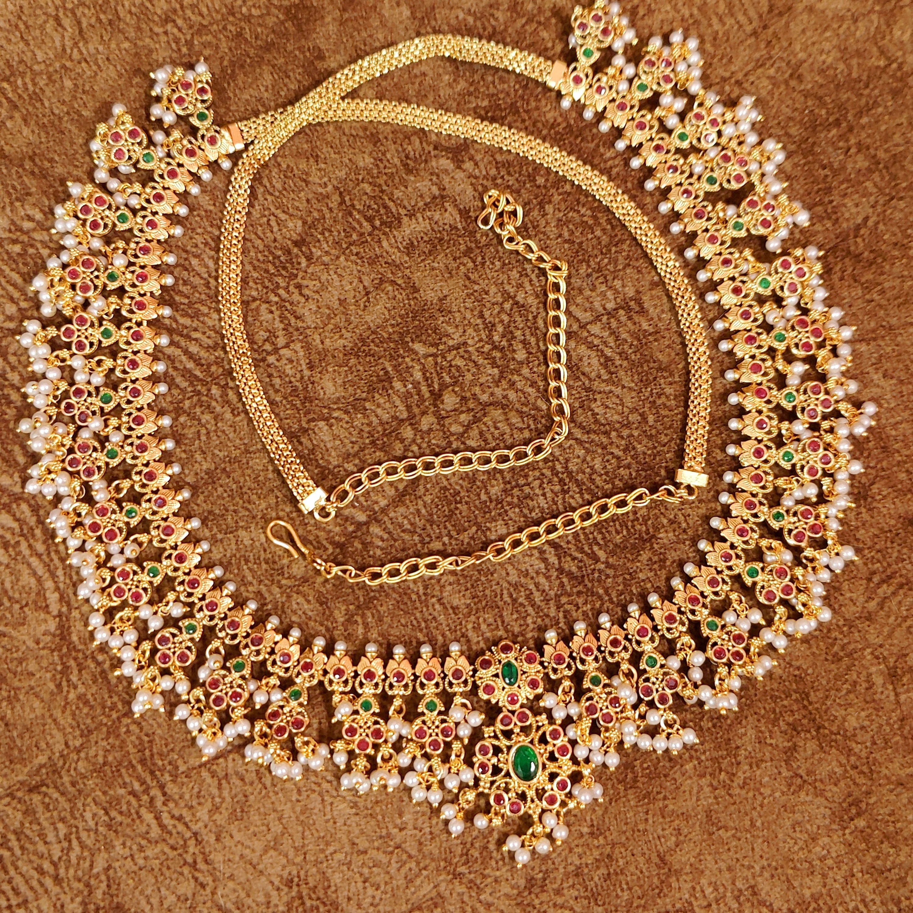 Enhance your traditional ensemble with this Gold Plated Ruby & Emerald Premium Waistbelt, designed to add a touch of royalty to your look. Adorned with vibrant ruby and emerald stones, this waistbelt exudes elegance and grandeur. The intricate gold-plated detailing makes it a perfect accessory for weddings, festive occasions, and cultural celebrations. Its adjustable fit ensures comfort while complementing sarees and lehengas effortlessly.
