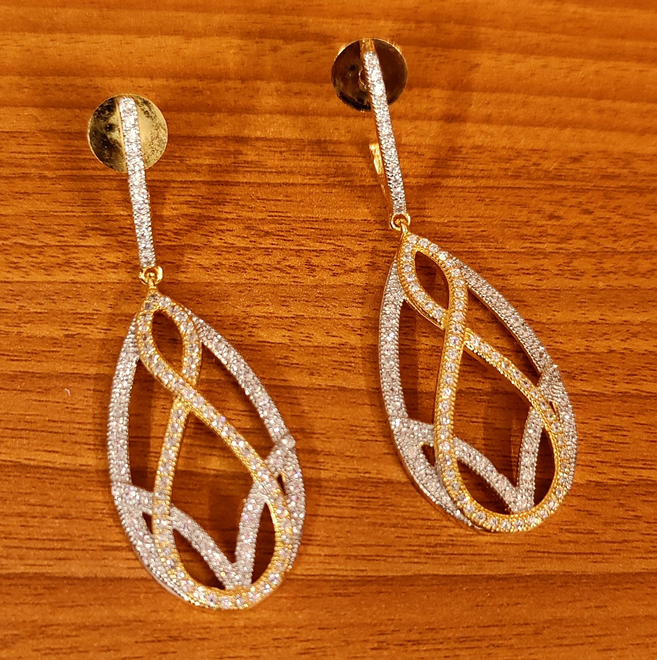 These diamond look earrings are handcrafted in silver and brass alloy with imitation american diamonds of very fine quality. These medium sized party wear earrings are handcrafted with fine finishihng and plated with real 18kt fine nickel free silver & gold rhodium that gives a real diamond look to the design.