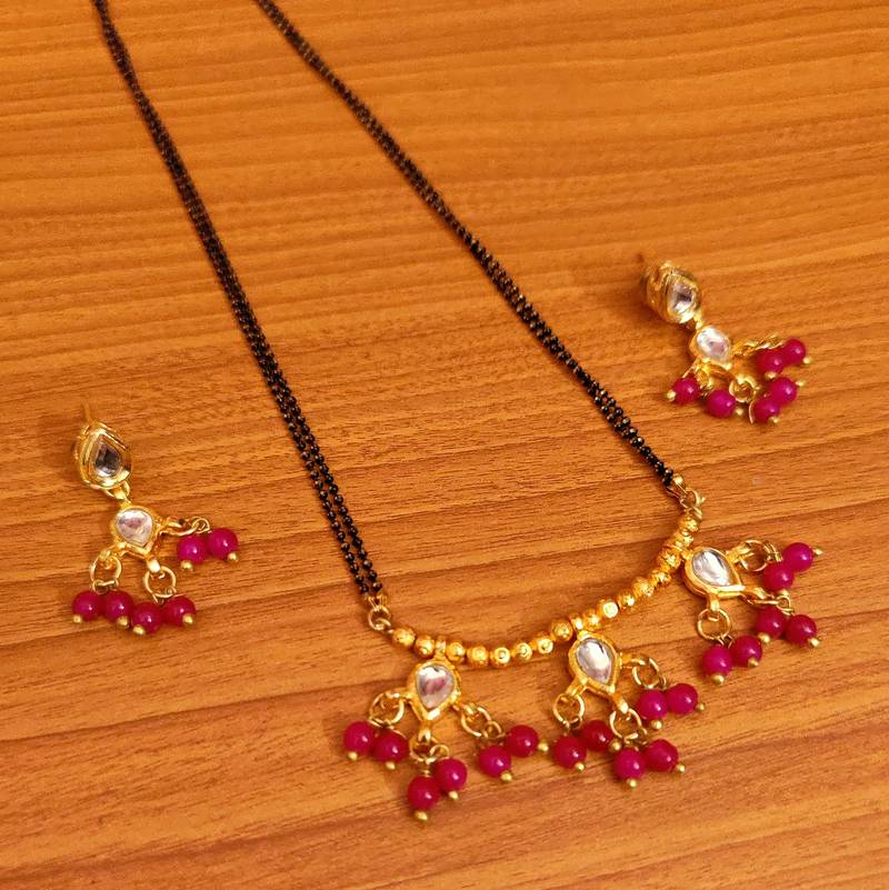 This Mangalsutra Is Handcrafted In Brass Alloy With Imitation Pink Colour Beads Work Of Very Fine Quality , The Mangalsutra Set Is Plated In 18kt Gold Plating And The Design Itself Is Perfect For Wedding Attires.