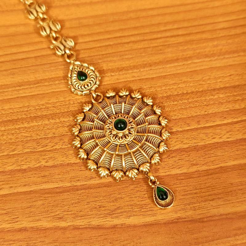GREEN ANTIQUE MATT GOLD PLATED WEDDING MAANG TIKKA