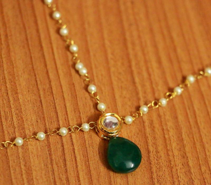 This kundan look mathapatti is handcrafted in silver alloy with imitation emerald colour quartz & kundan polki stones of very fine quality . This mathapatti is coated with gold rhodium plating as done on the real jewellery . The design itself looks very real and is perfect for wedding wear.