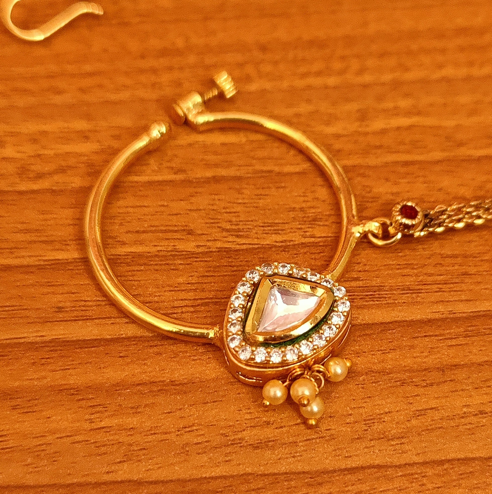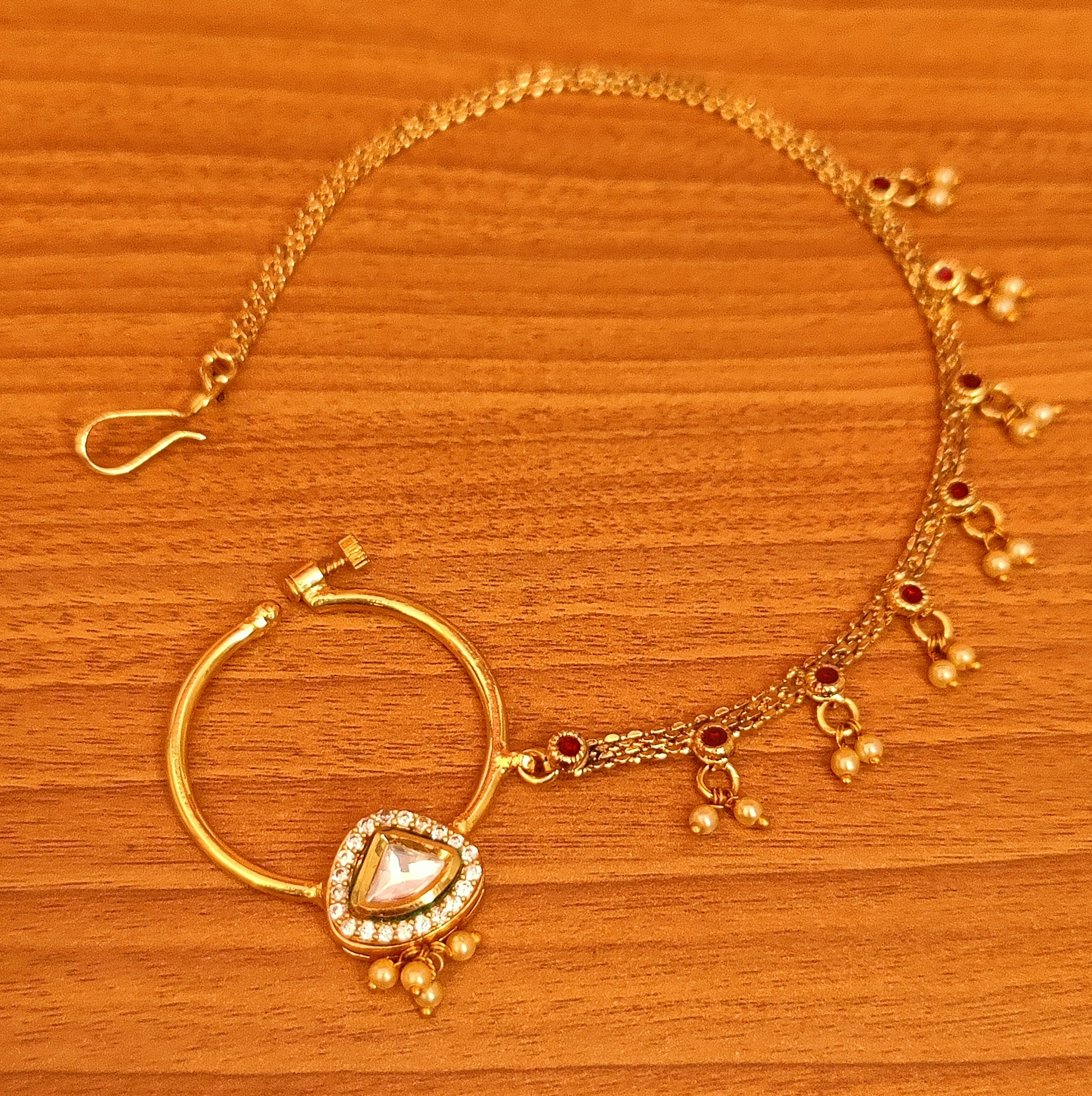 This beautiful nose ring is handcrafted in brass alloy with imitation cz stone & pearls and kundan with meenakari work of very fine quality . this nose ring is coated with 18 kt gold polish which give it a real look . an absolutely stunning piece to own and is very light in weight.