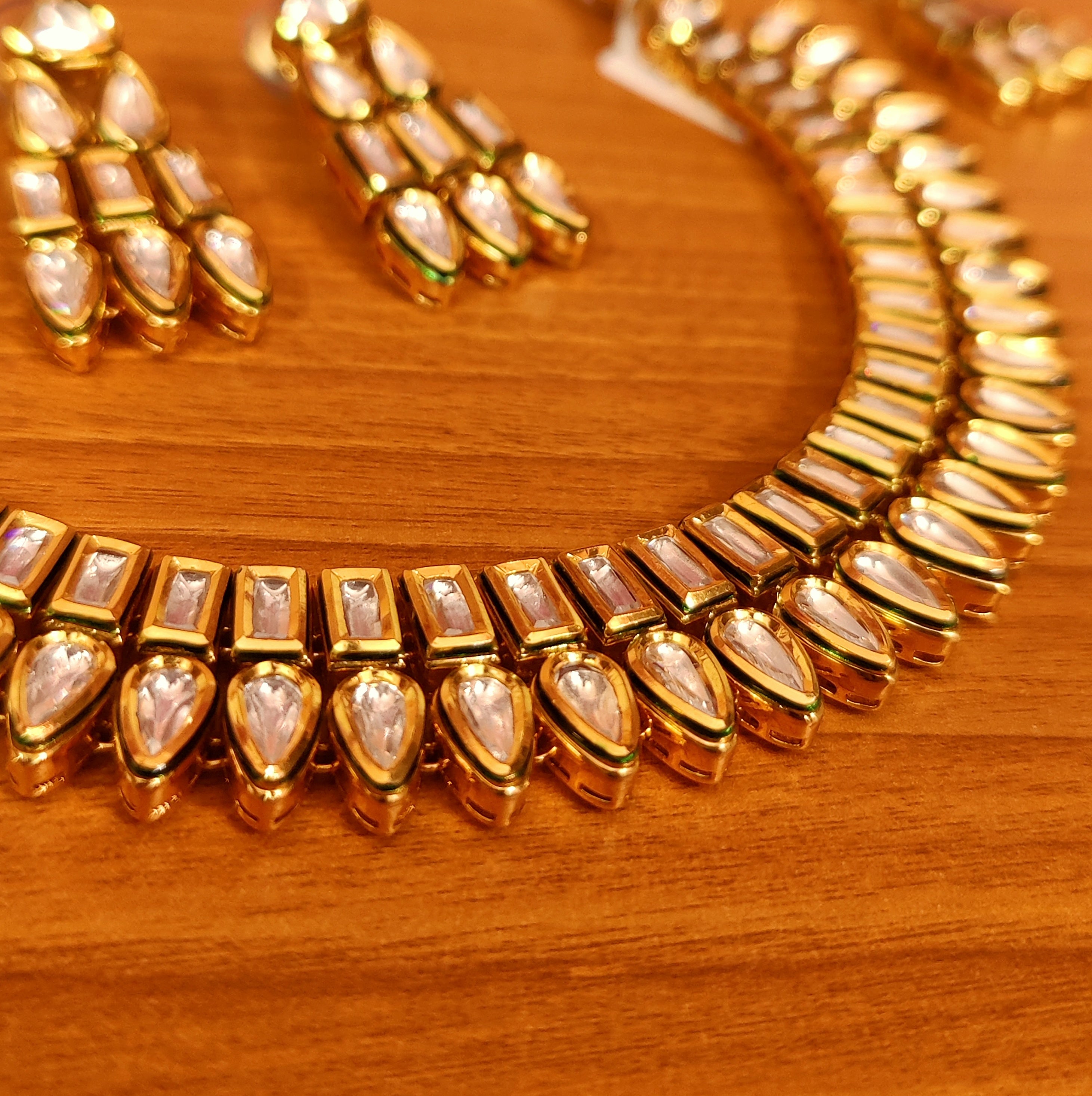 This beautiful necklace set is handcrafted in brass alloy with imitation kundan with meenakari work of very fine quality . this necklace set is coated with 18 kt gold rhodium plating that gives a real gold look . an absolutely stunning piece to own and are light in weight.