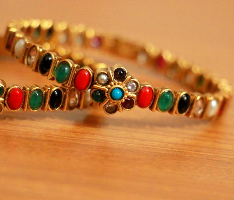 These navratan bangles are handcrafted in copper alloy with imitation multicolour stones & pearl of very fine quality. These artistic yet modern bangles are plated with fine nickle free gold rhodium to avoid any allergies to the skin.